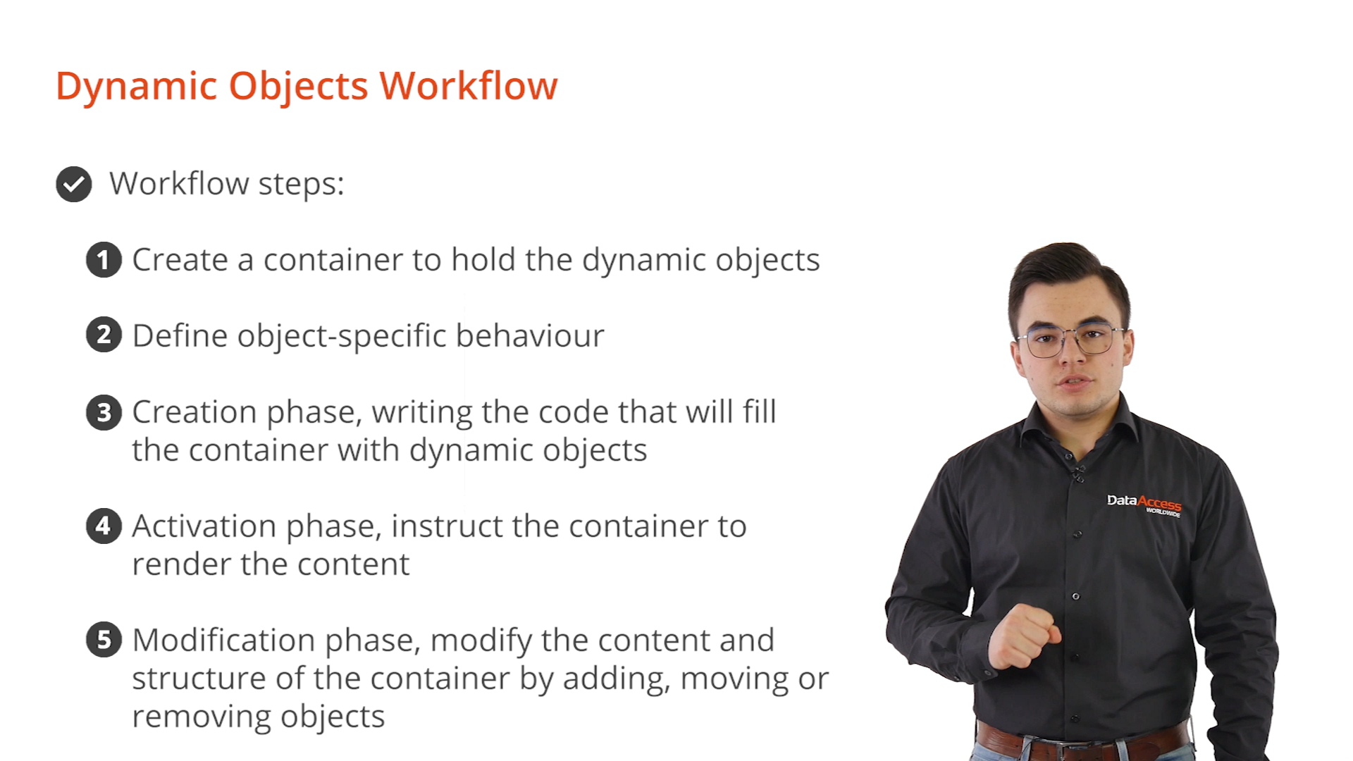 - Step Three - Creation Phase: in this phase, the initial set of dynamic objects are added to the container. The container automatically displays all objects when it is activated. This step is optional, because the container can remain empty.