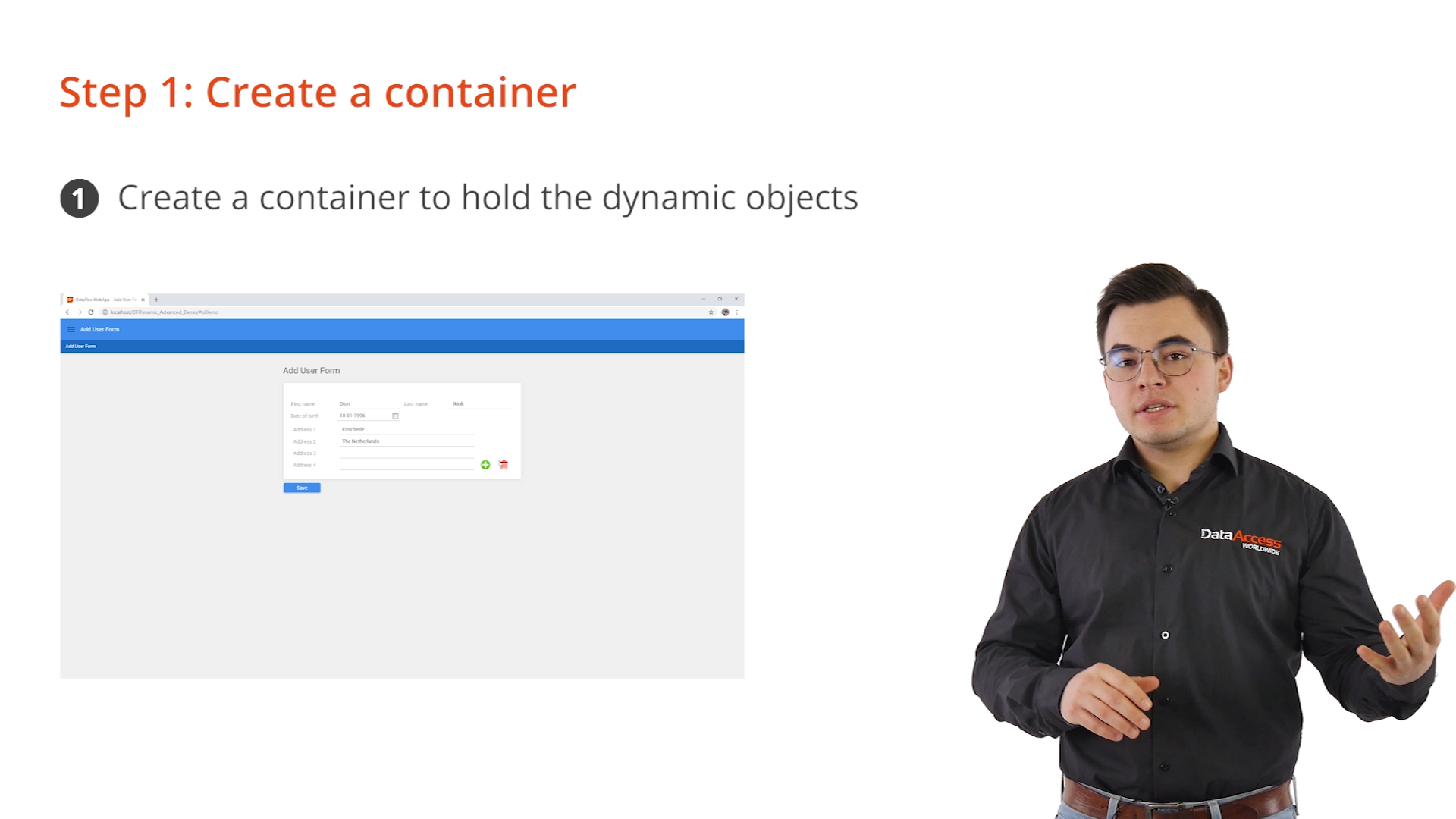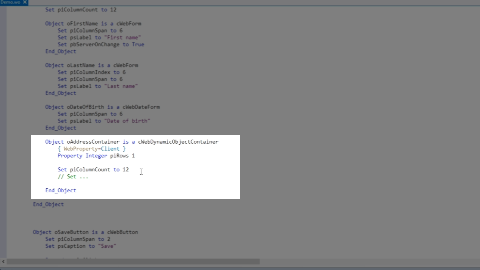 The application that will be built through out the remaining lessons is for simply adding a new user to an arbitrary application. The application is unique because it allows the user to add additional address lines if needed. There will be two controls to the right of the first address line that allows additional lines to be added or removed. This lesson will demonstrate step one, how to create a dynamic container.