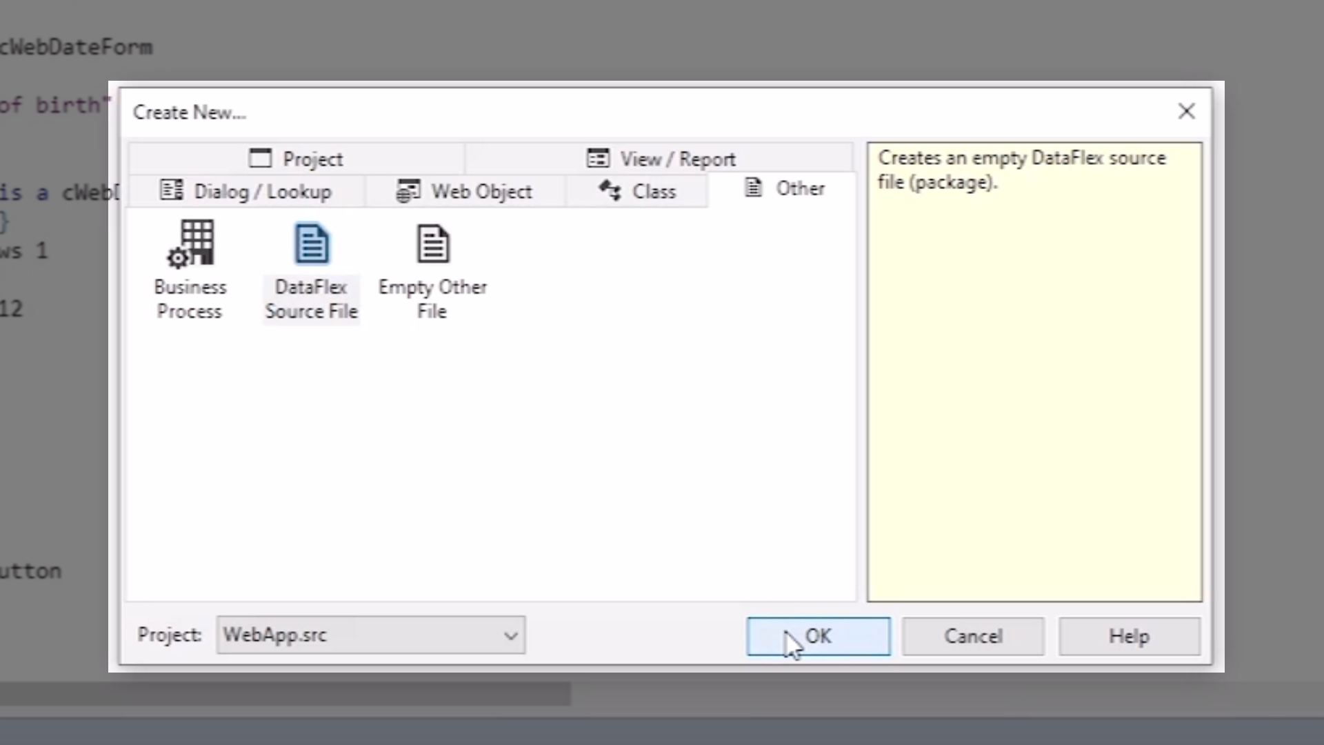 - Select ‘DataFlex Source File’ from the ‘Create New’ window and select OK