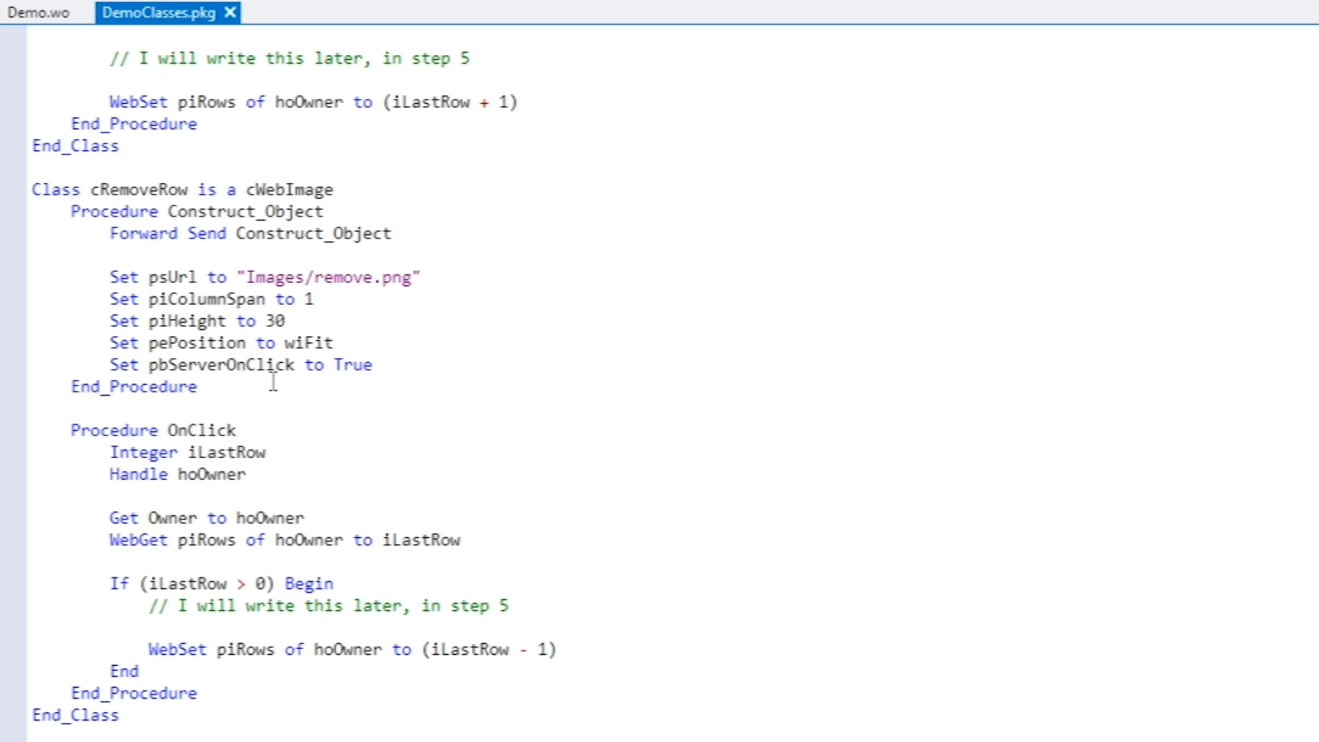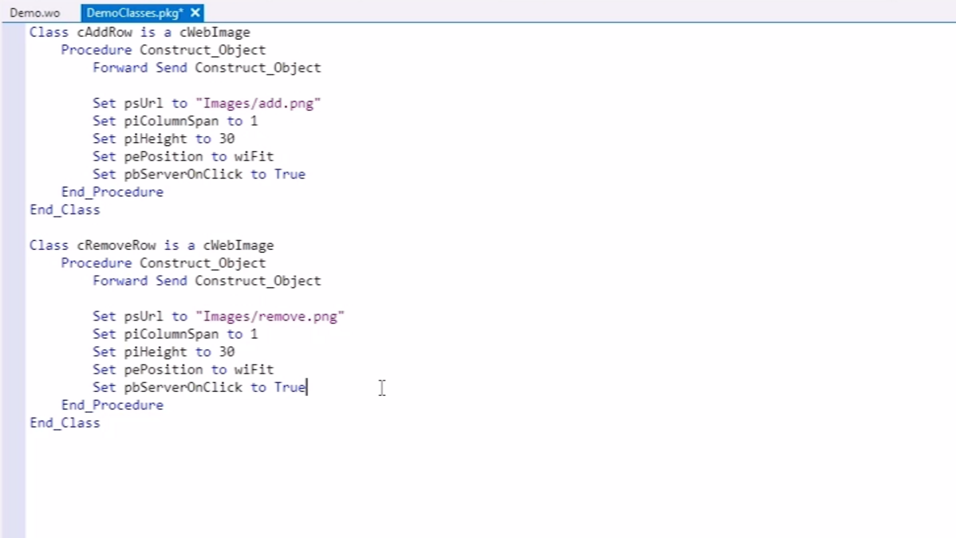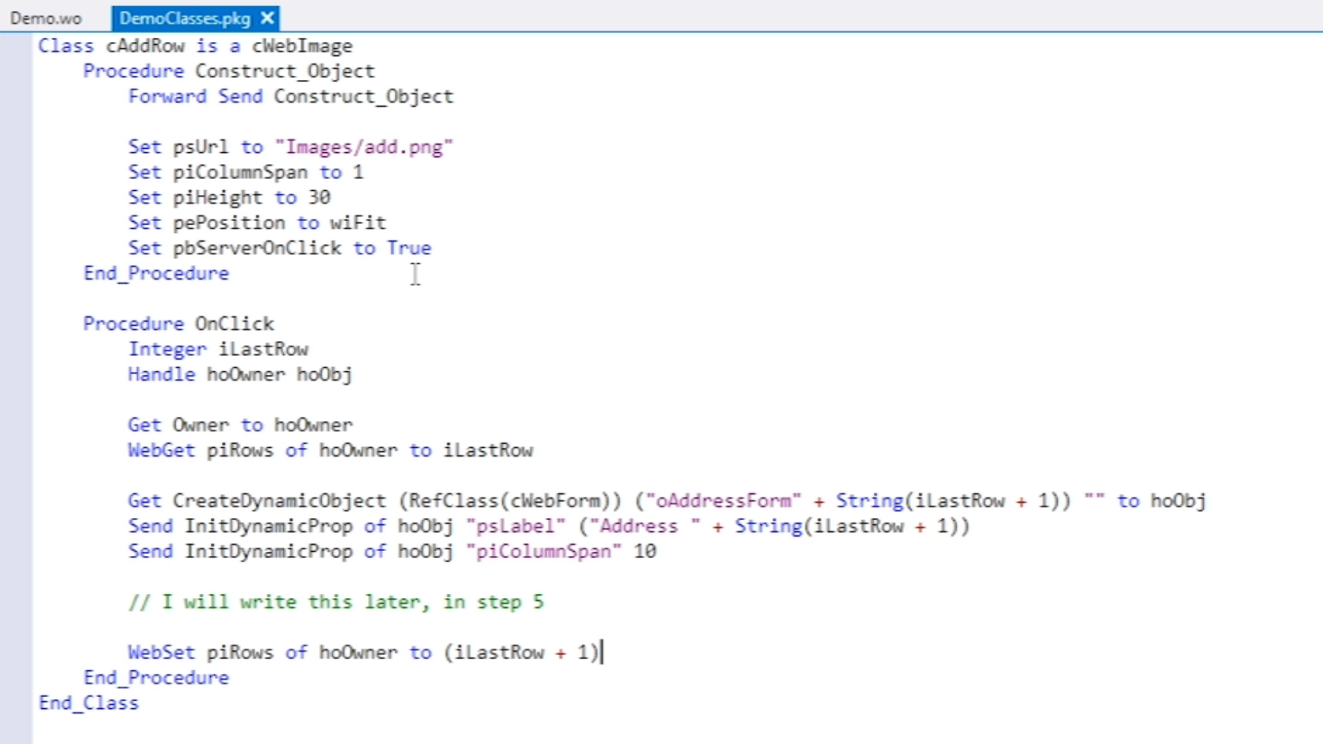 - Continuing to work with DemoClasses.pkg in the DataFlex Studio, and starting with the cAddRow button…