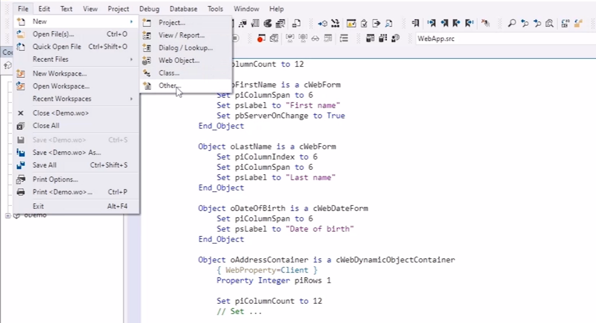 - From the DataFlex Studio select FILE > OTHER from the main menu
