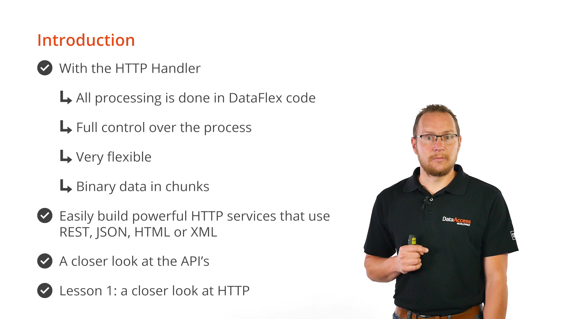 With the HTTP Handler all processing is done in DataFlex code, which provides full control over the whole process. The way the HTTP Handler is bound to the to specific URLs in an application is very flexible and can work with chunks of binary data. The HTTP Handler can be used to easily build powerful HTTP services that use REST, JSON, HTML or XML.