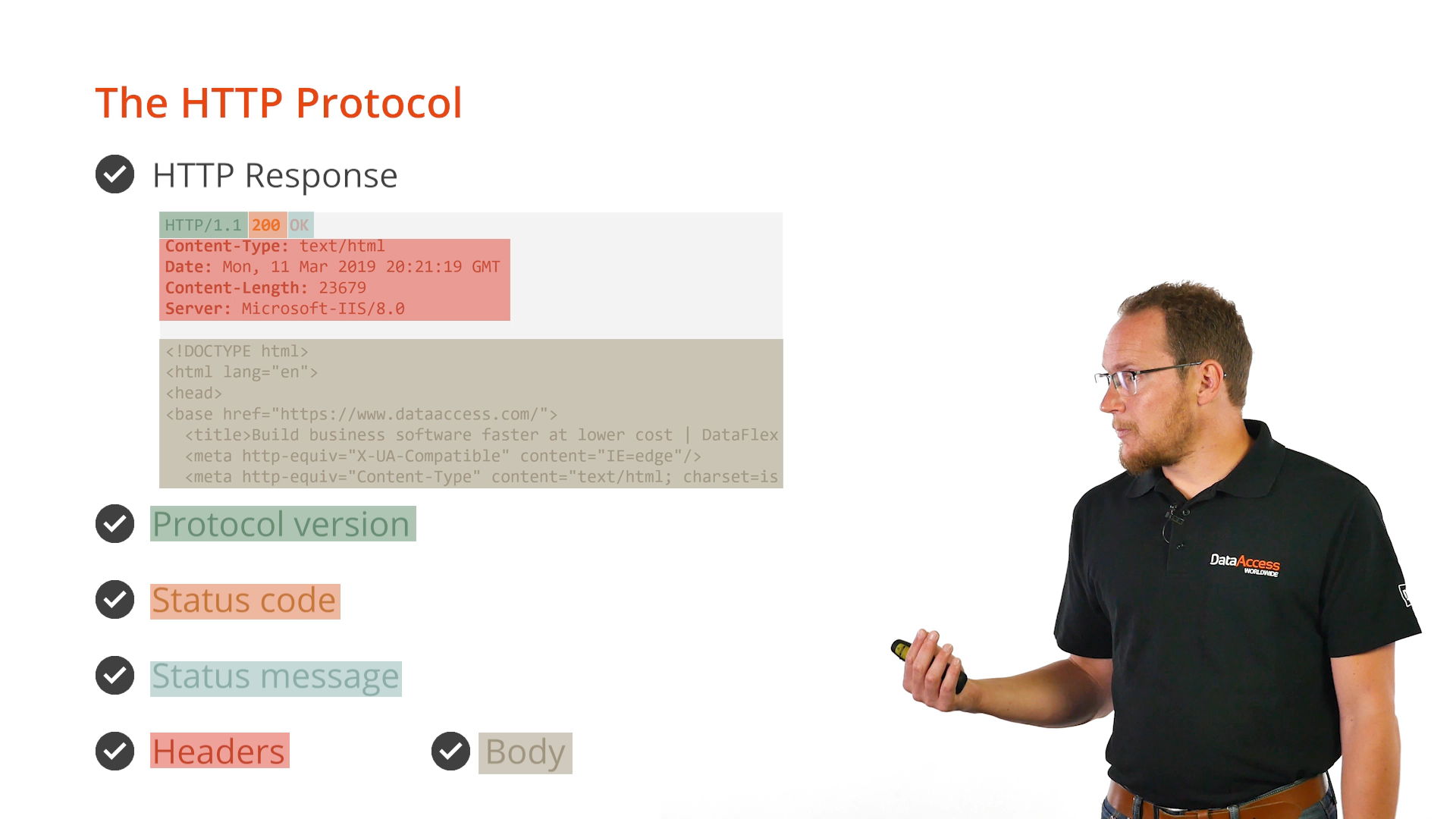 HTTP responses first include the protocol version, and then a status code. The status code indicates to the client if the handling of the request went well or if something is wrong. There is also a status message, which is a textual description of that status. A set of headers are also returned. The body follows the headers and can basically be anything. A commonly used header is the content-type header that usually indicates the type of content that is sent back.