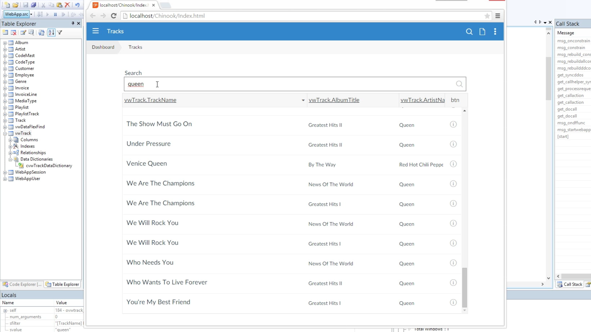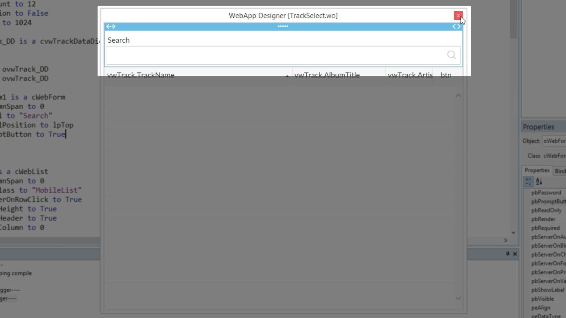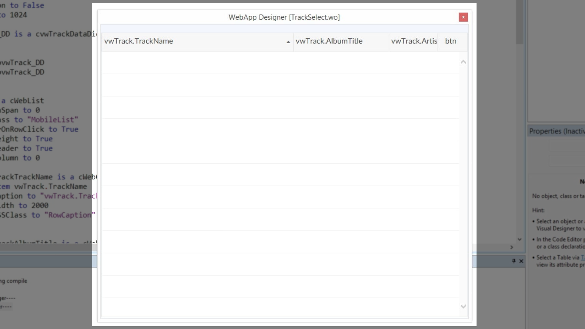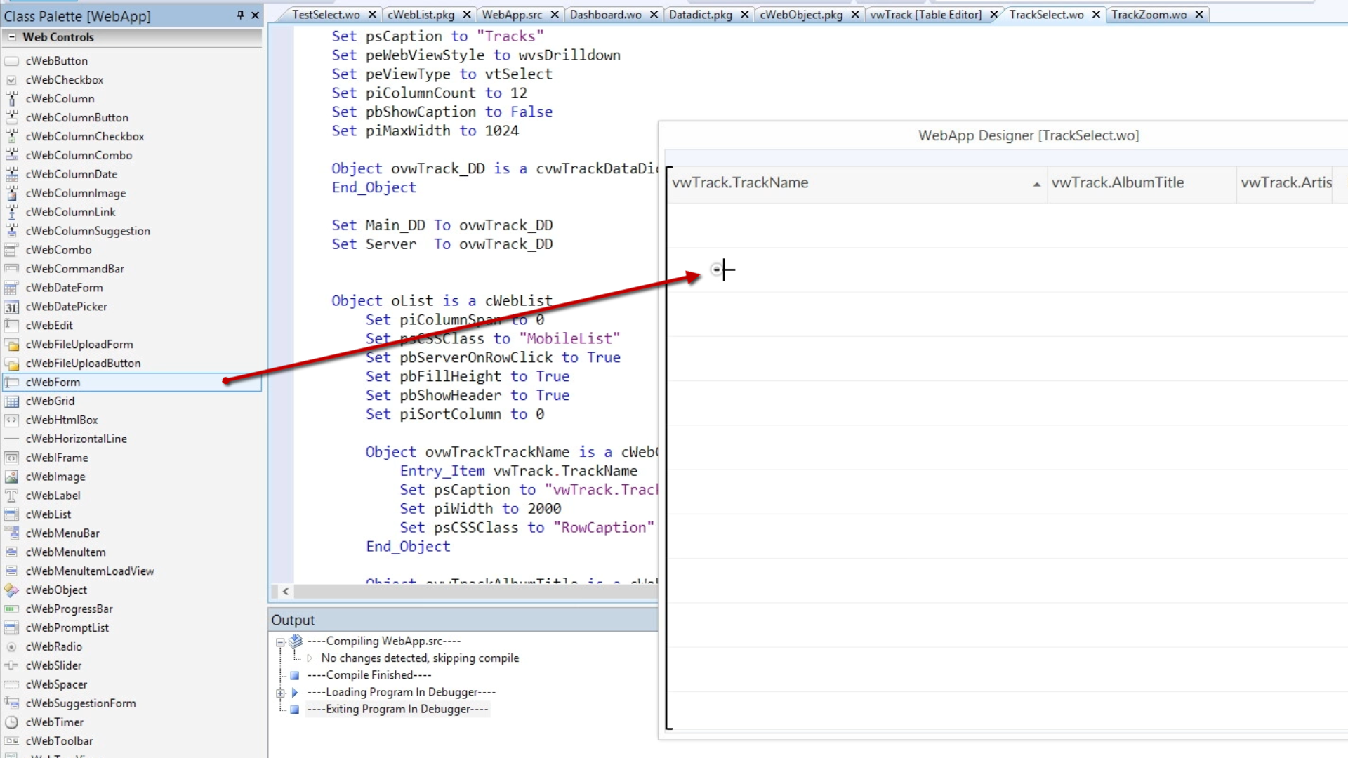 Return to the DataFlex Studio, and make sure the TrackSelect.wo is open.