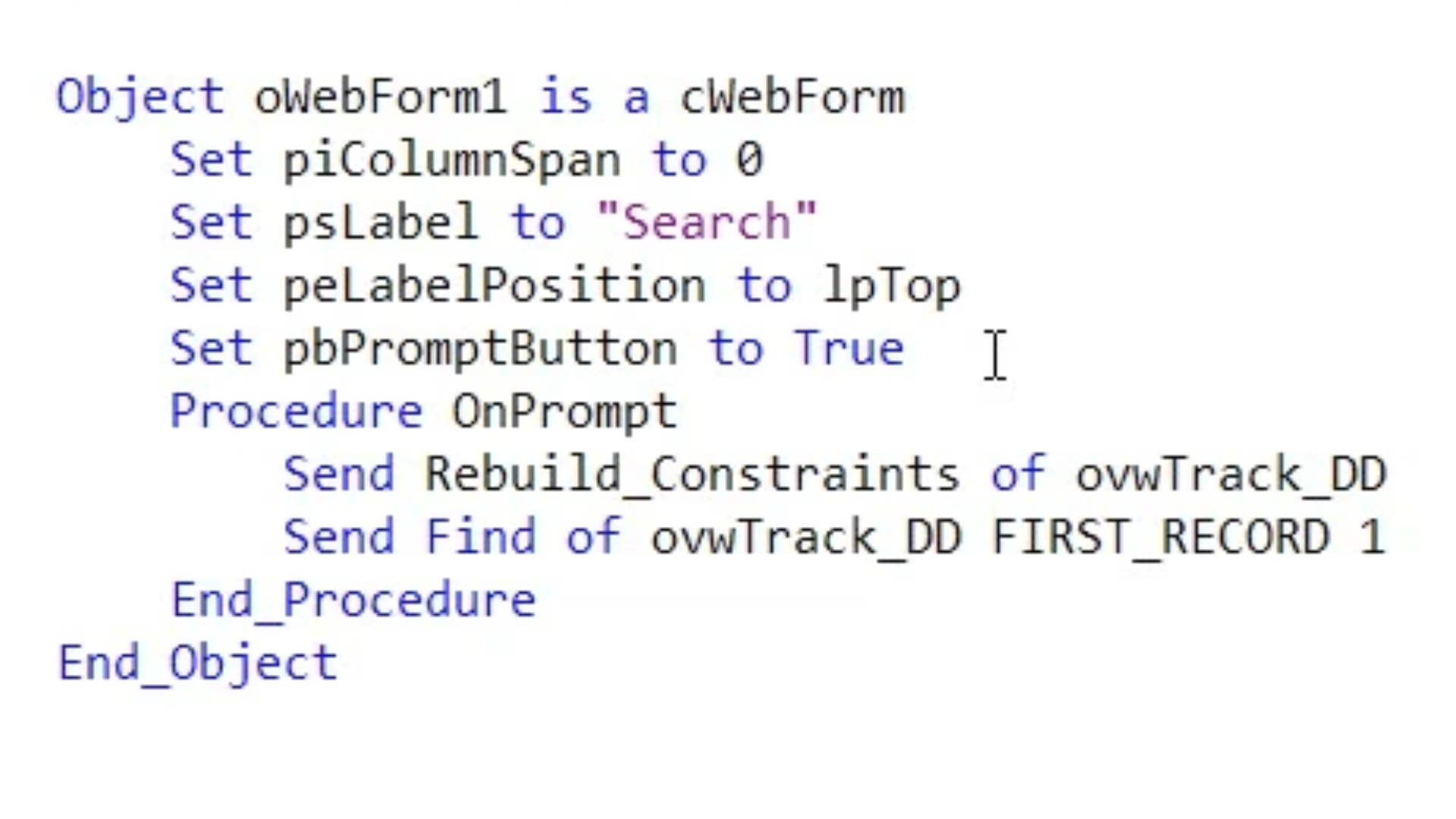 In the data dictionary the ‘Procedure OnConstrain’ needs to be implemented, so that it constrains the rows to the search value. To do that locate Object ovwTrack_DD is a cvwTrackDataDictionary, and add the following below it…
