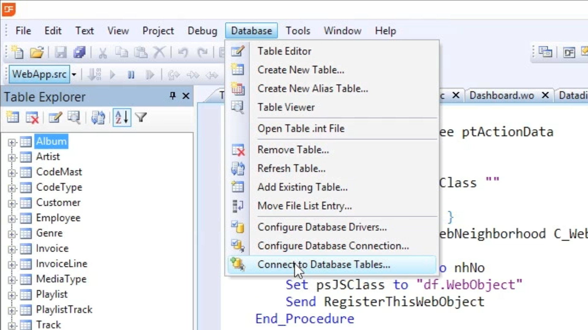Select CONNECT TO DATABASE TABLES from the DATABASE menu at the top to open a connection wizard.