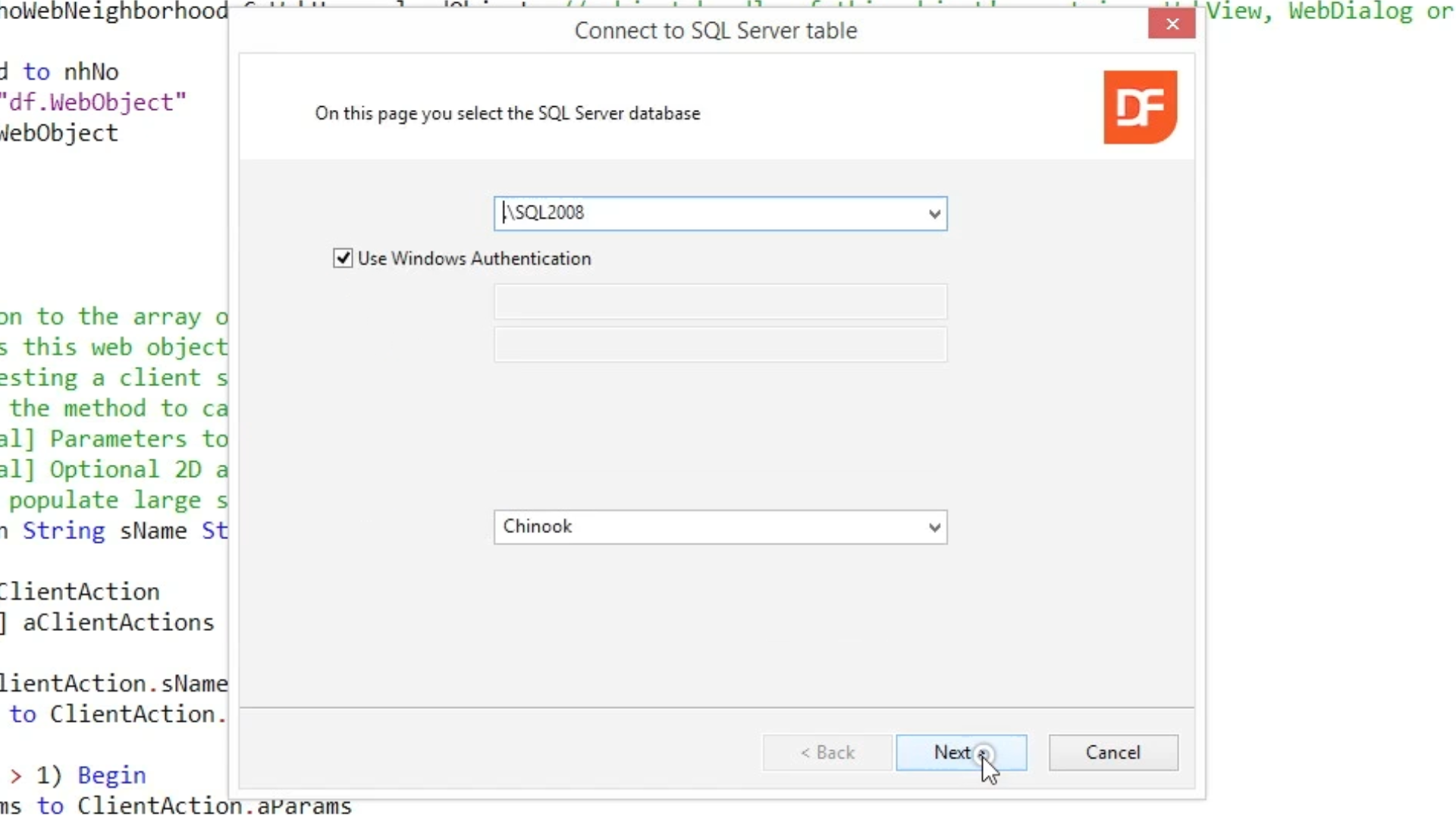 On the Database Selection screen specify the desired server and database. Select NEXT twice.