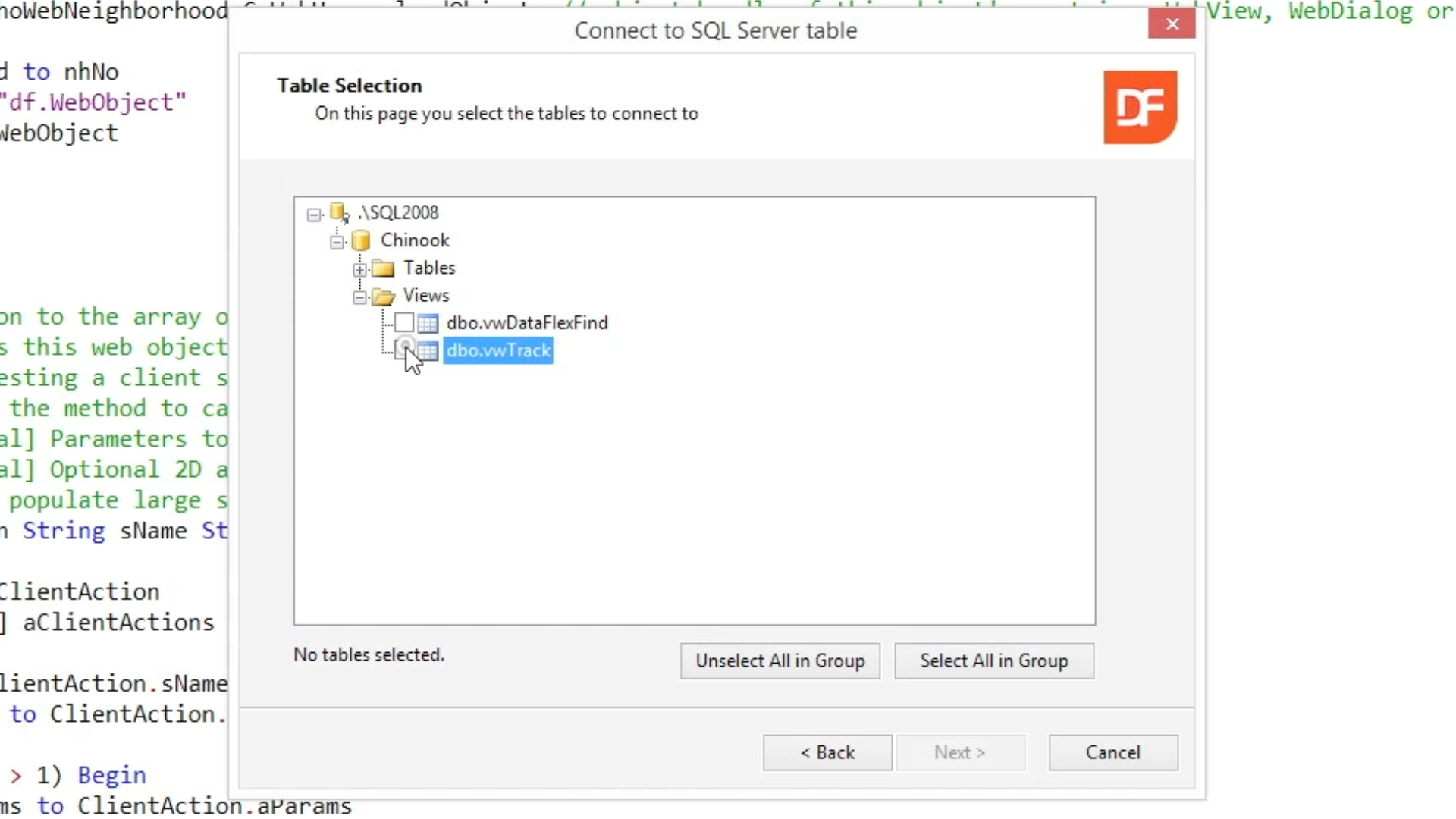 On the Table Selection screen expand the Views directory, and select the previously made view (dbo.vwTrack). Select NEXT.