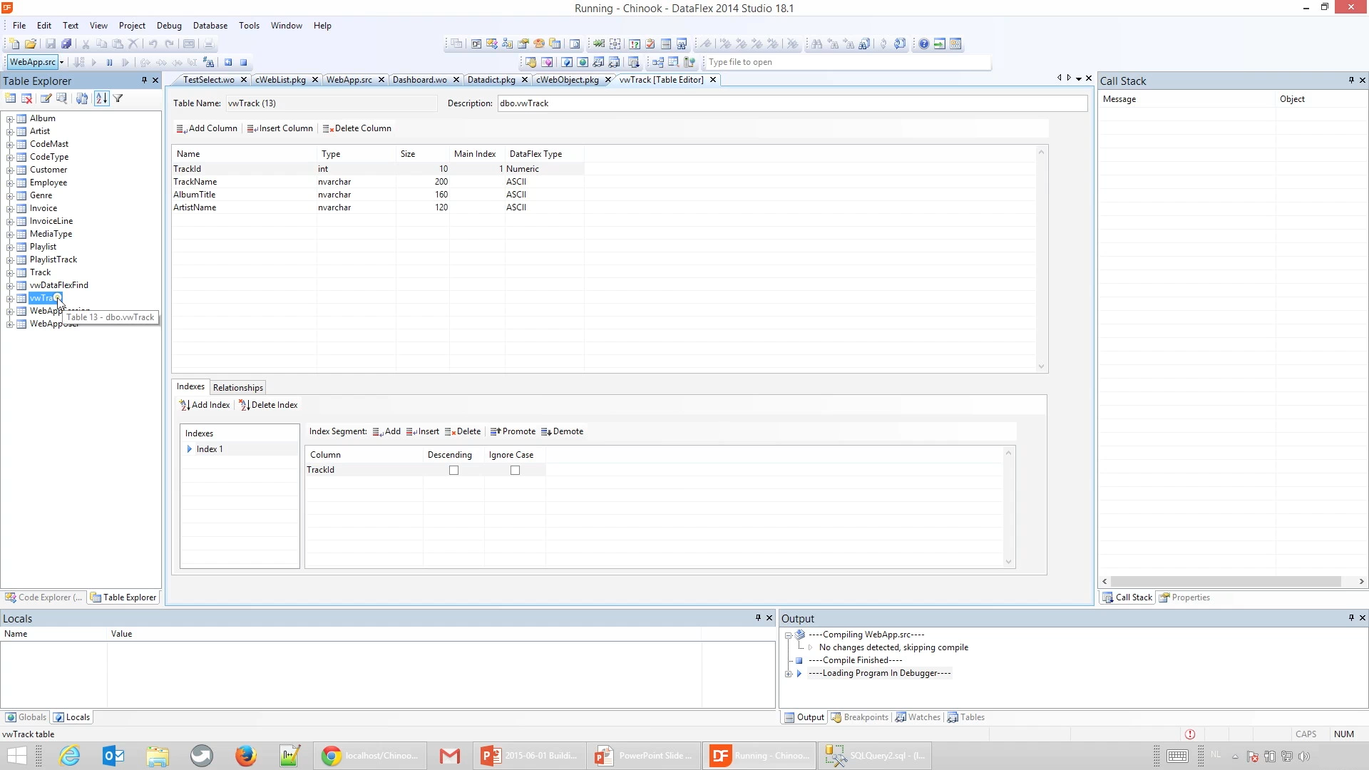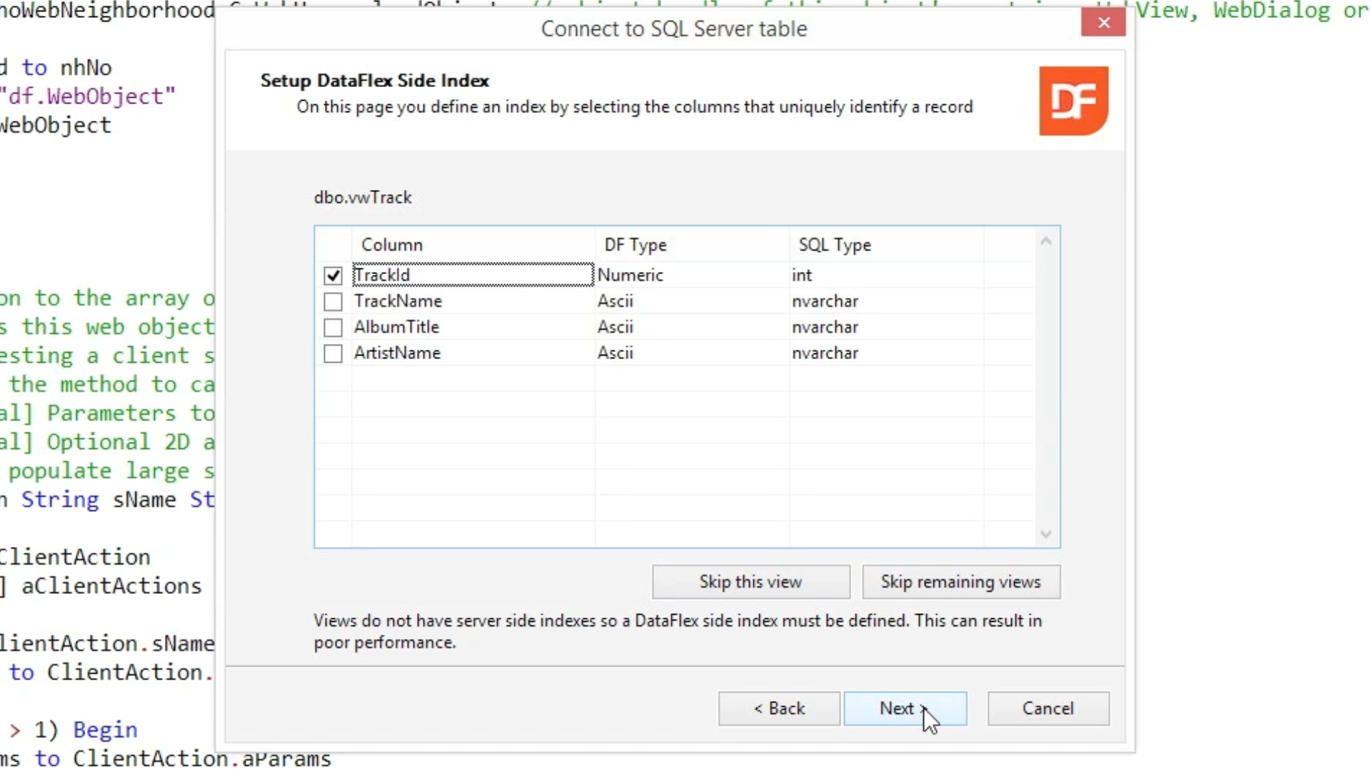 On the Setup DataFlex Side Index screen choose the columns that uniquely identify the view to make it selectable (TrackID). Select NEXT three times, and then FINISH.