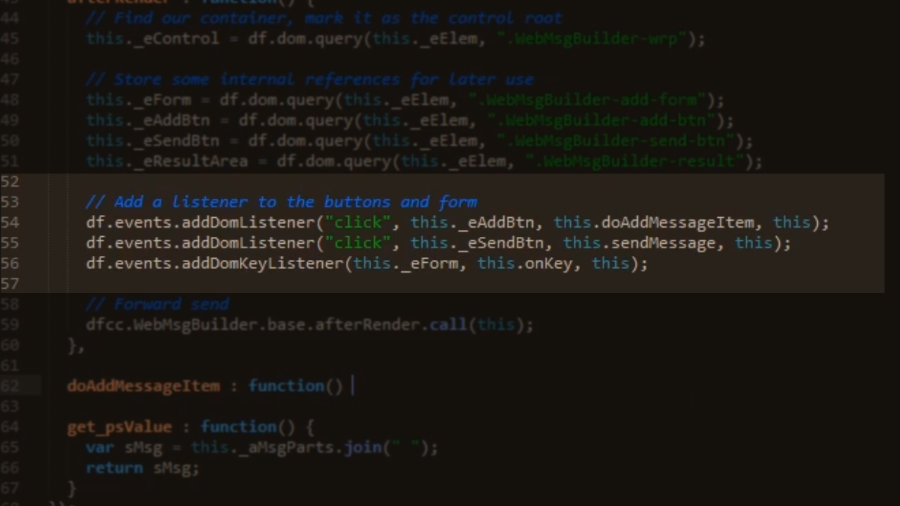 df.events.addDomListener(“click”, this._eSendBtn, this.sendMessage, this);