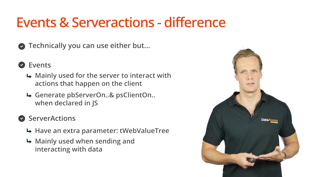Events and server actions are similar, so it’s important to understand the differences. Technically you can use either interchangeably, but: