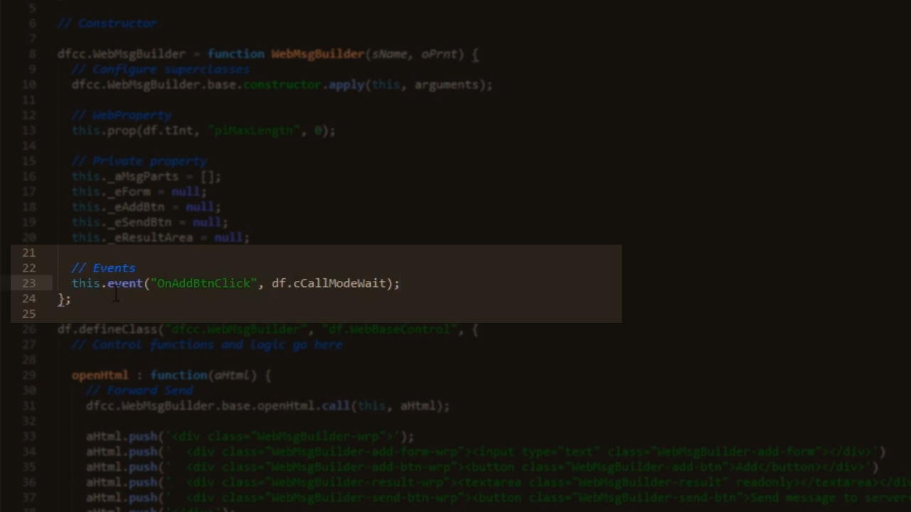 - To create the event at the client in the JavaScript code, open WebMsgBuilder.js in the text editor