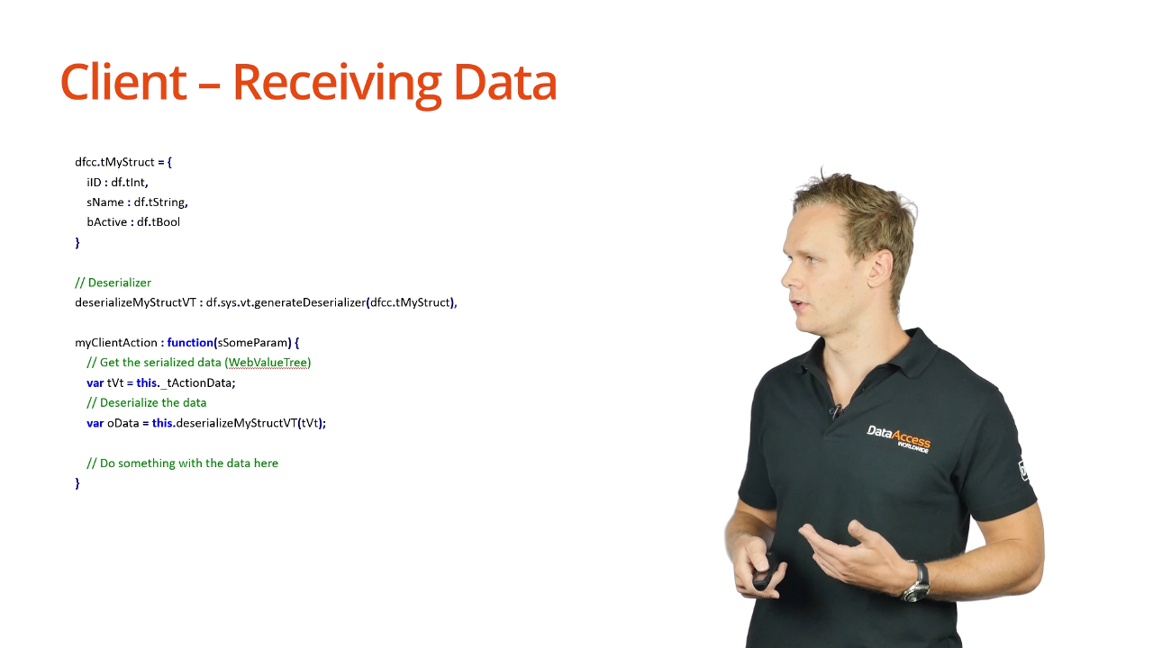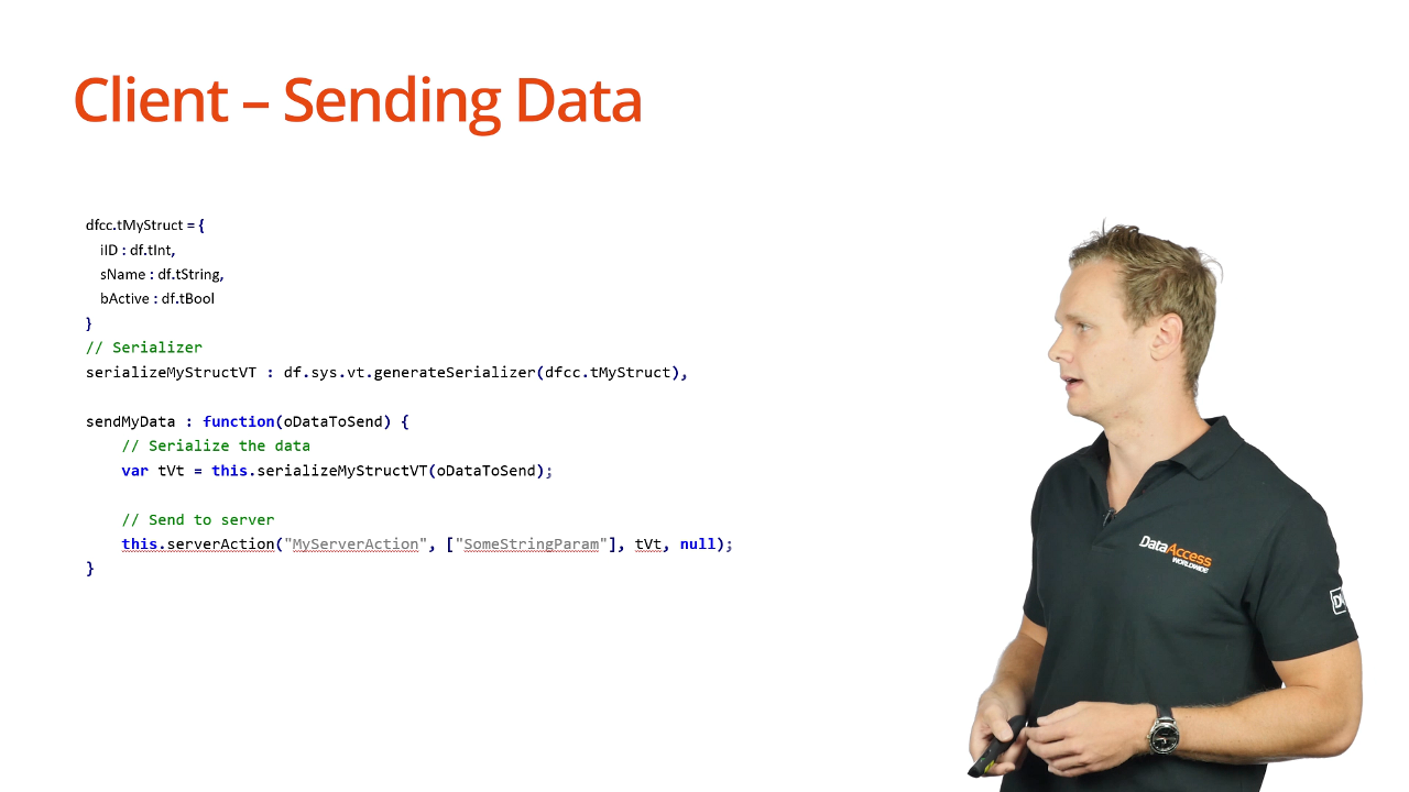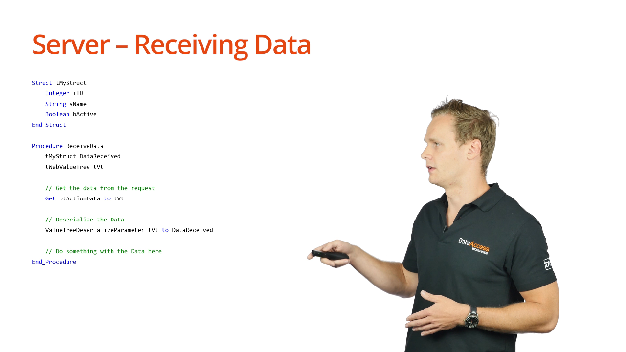 To receive the data from the client on the server, use the ptActionData property to get the data in DataFlex