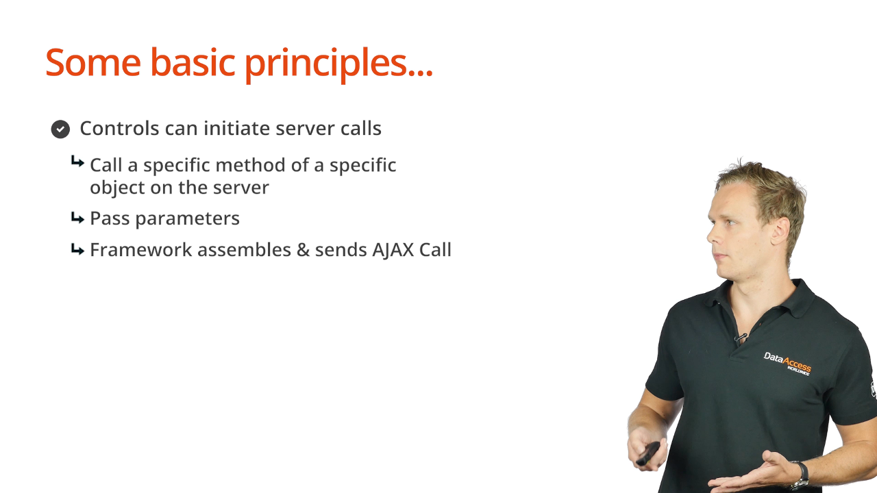 - Controls at the client can initiate server calls. This means that they can call on a specific method of a specific object from the client on the server. Parameters are passed along, and the WebApp framework assembles and sends the AJAX call.