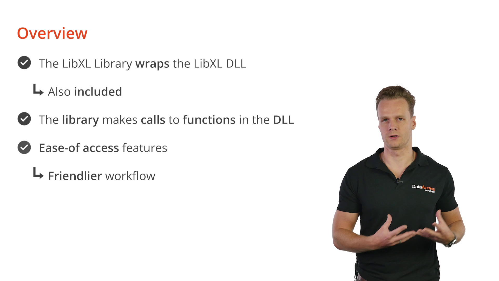 The LibXL Library wraps the LibXL DLL, which is also included. At its core level, the library simply makes calls to the functions exposed in the DLL. However, we’ve included various “ease-of access” features that make working with the library much friendlier than the raw DLL. Some quick examples include a more object oriented approach as well as handles to books, sheets, etcetera for you to work with.