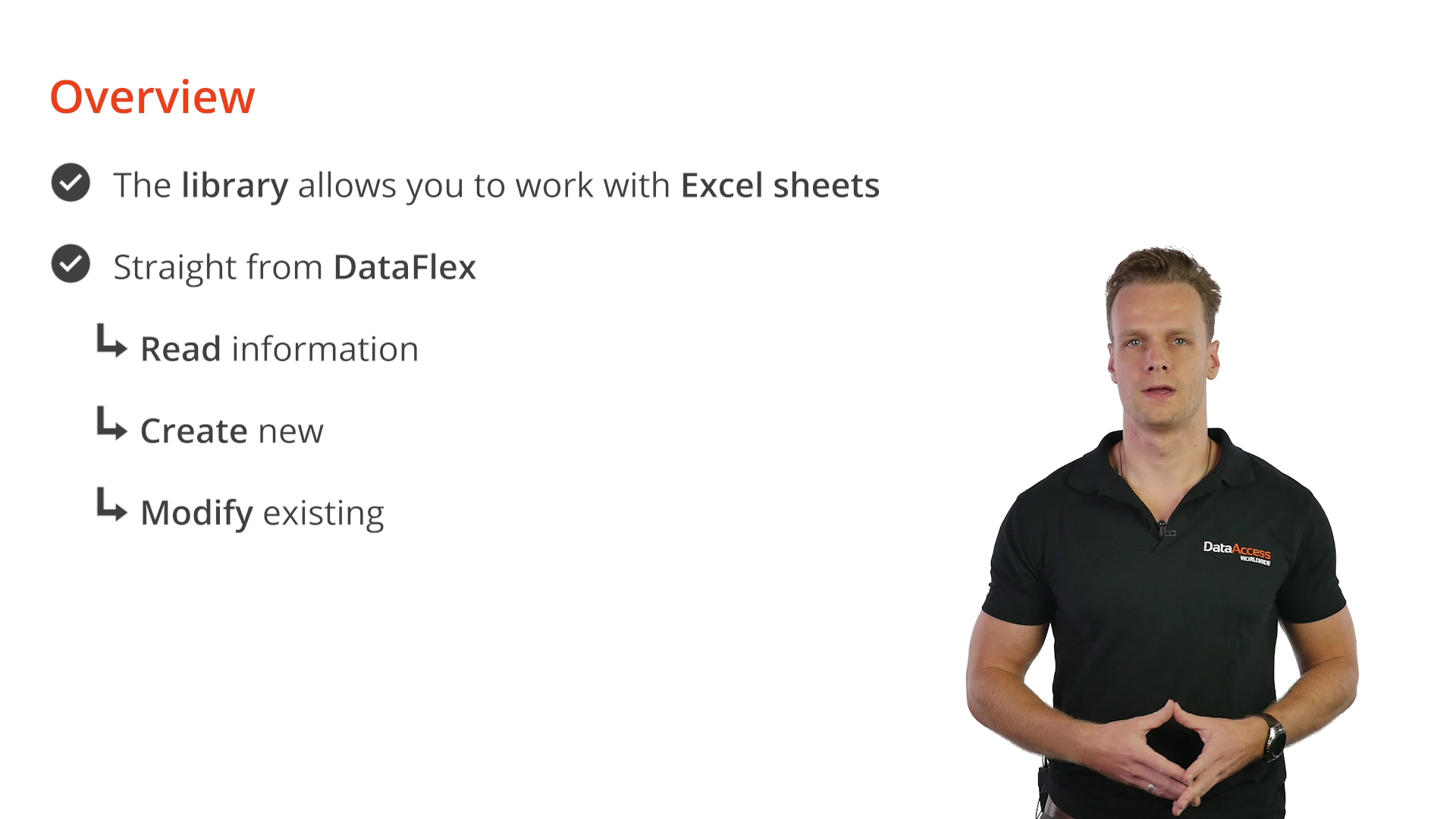 The library allows you to do a great number of things you’d expect to be able to do with an excel sheet, straight from DataFlex. It lets you read information from excel files create new sheets or modify existing ones. Inside sheets, it supports features like Formulas, Images and Inserting or Deleting entire columns or rows.