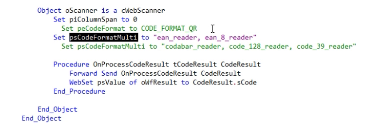 - psCodeFormatMulti allows you to prime the scanner to look for a set of specific formats by providing it with a comma separated string, with the exact formats inside