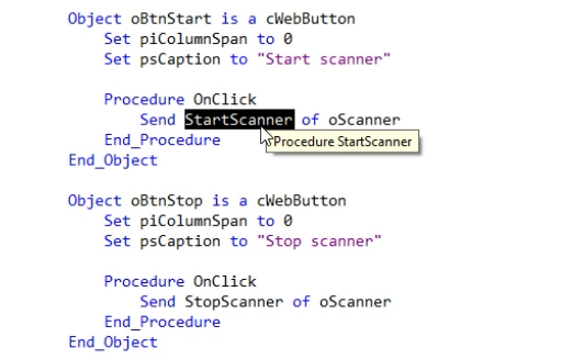 - Finally, we have to always start our scanner and, depending on our settings, stop it too. This is done by using “StartScanner” and “StopScanner”