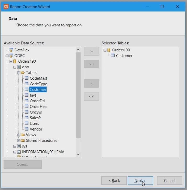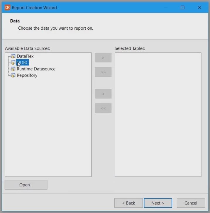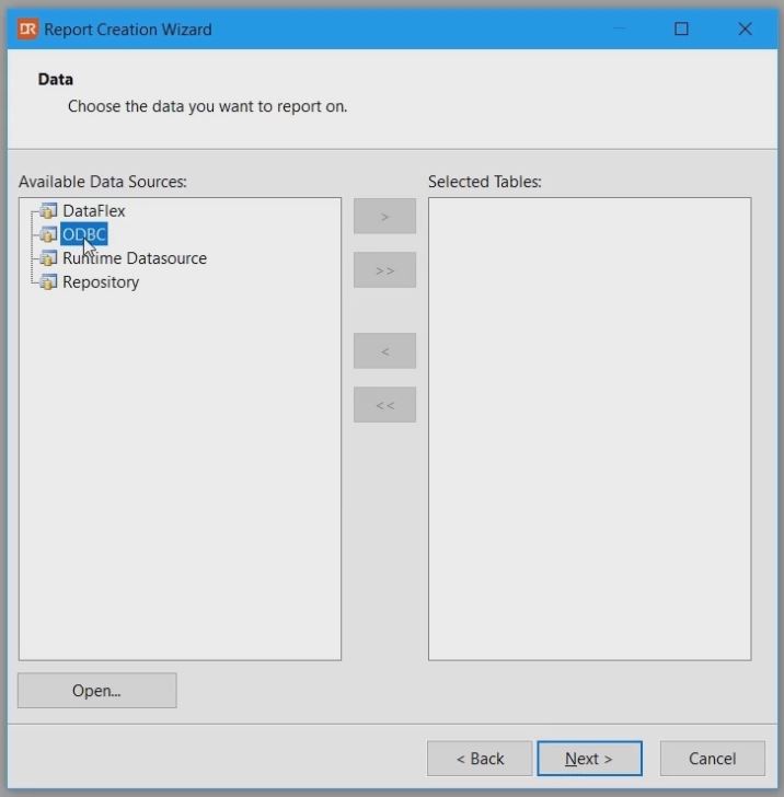Continu with the new report creation wizard by selecting the just created data source, ODBC.