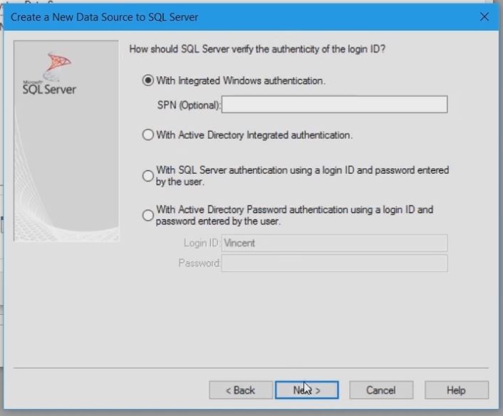 Enter login credentials for this SQL Server. Choose integrated Windows authentification.