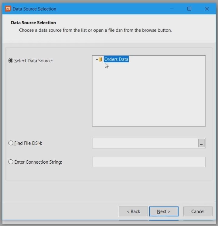 The wizard shows the content of your system and user DSN’s. This allows to use a file DSN or a connection string.