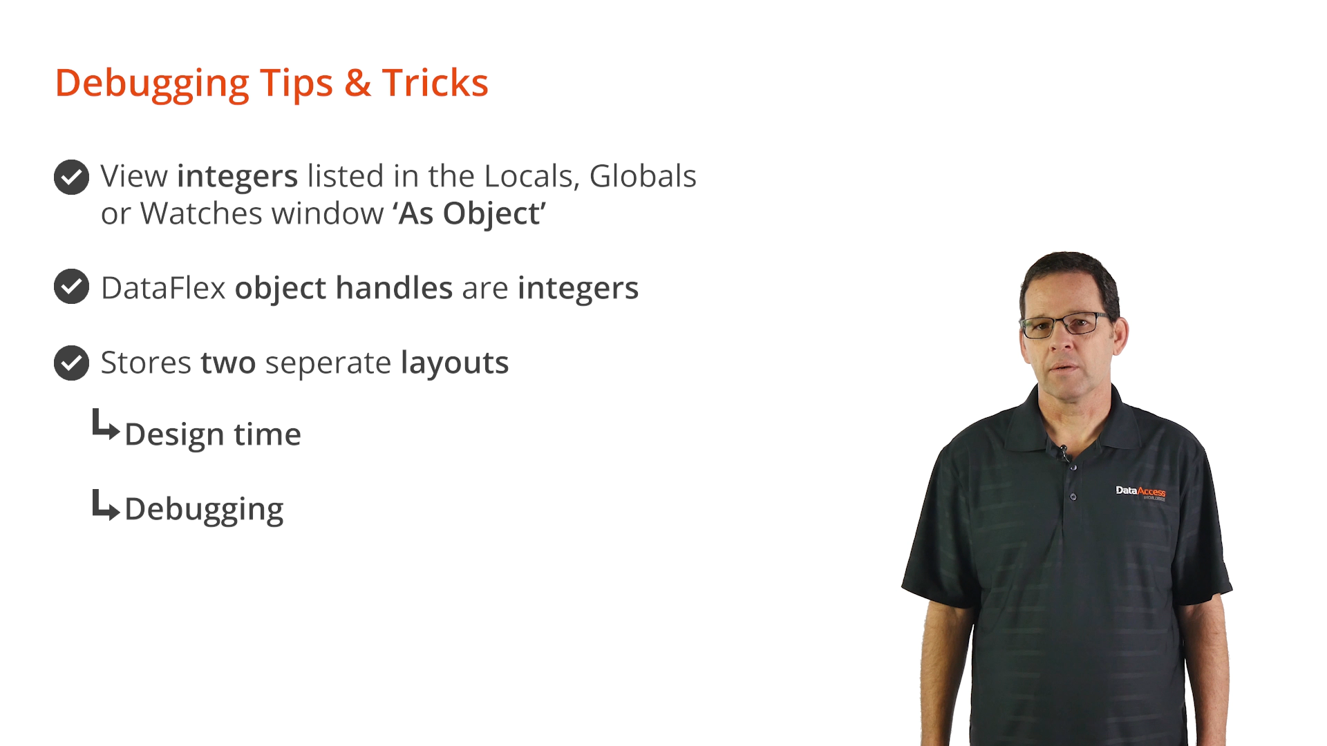 Any integer value can be viewed in the Locals, Globals or Watches windows as “As Object.” This takes advantage of DataFlex object handles being integers. This allows parent and child objects of that object to be viewed. The Studio stores two separate layouts; design time and debugging. Each layout is retained as the developer has arranged it. The default version of either layout can be returned to from the TOOLS menu.