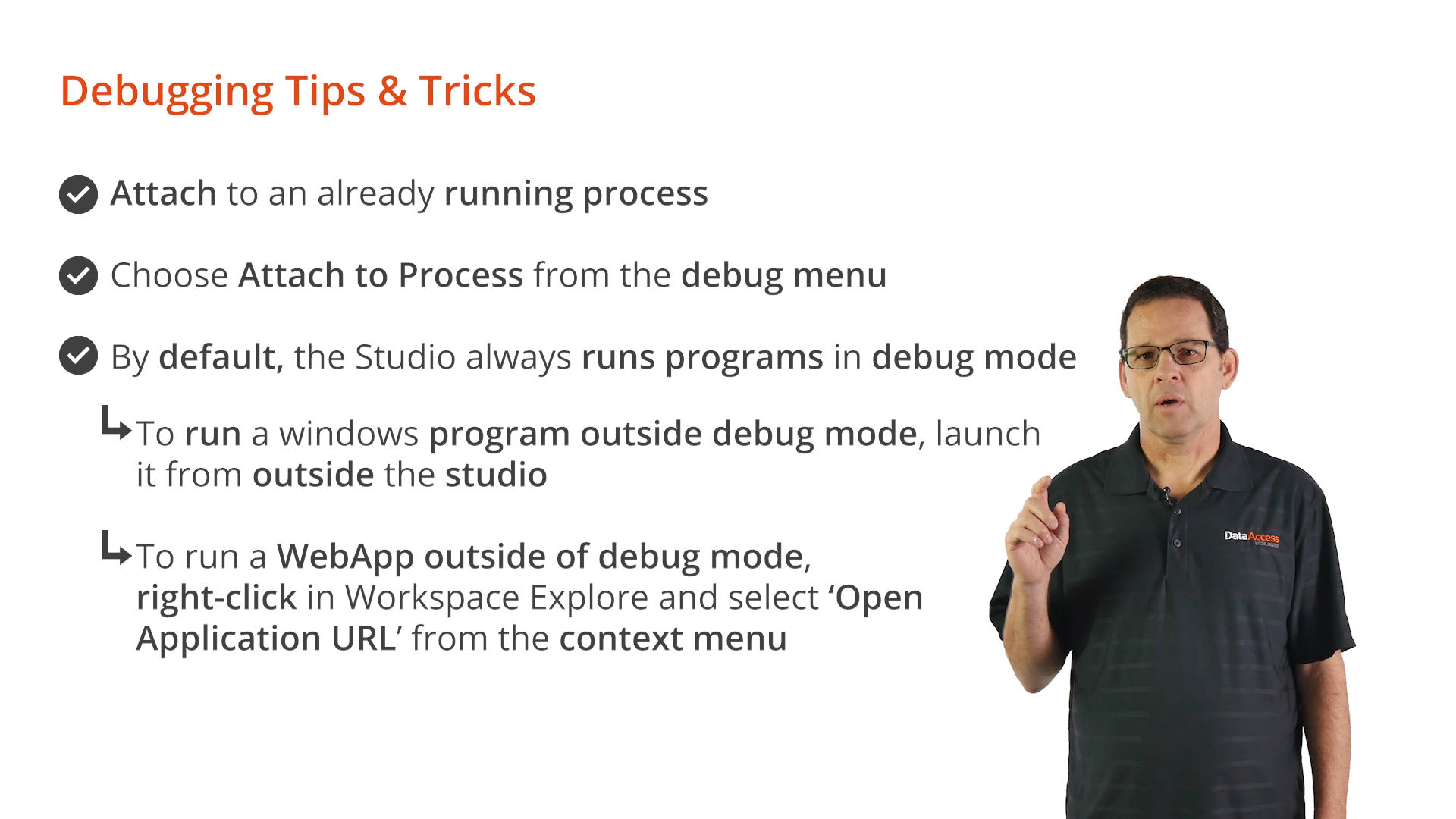 The Studio, by default, runs programs in debug mode. To run a Windows program outside of debug mode, launch it from outside the Studio. To run a WebApp outside of debug mode, right click in Workspace Explorer and select ‘Open Application URL’ from the context menu.