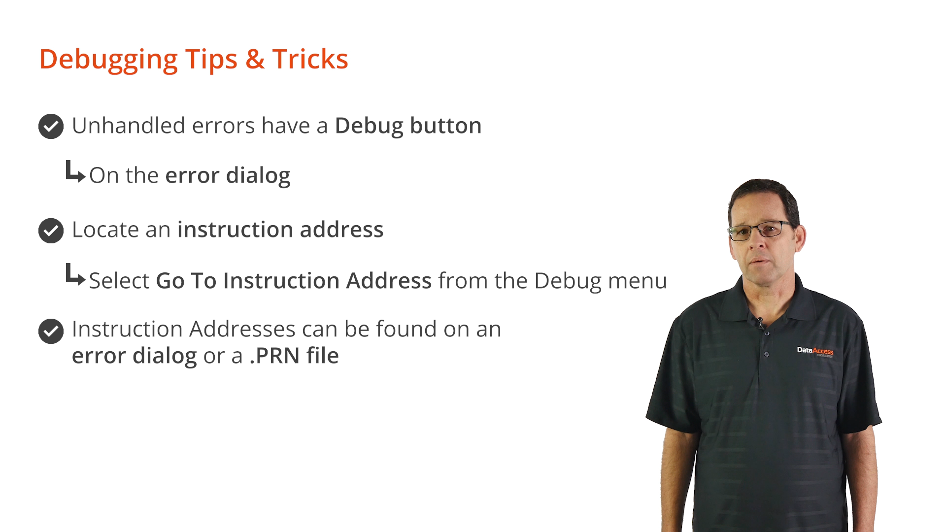 While debugging, unhandled errors have a Debug button in the error dialog that allows the location of the line that triggered the error to be quickly found. The location of an instruction address can also be found by selecting ‘Go To Instruction Address’ from the Debug menu. Instruction Addresses are created when a program is compiled, and the source code lines and files are combined. They can be found in an error dialog or a .PRN file, which is created when compiling.