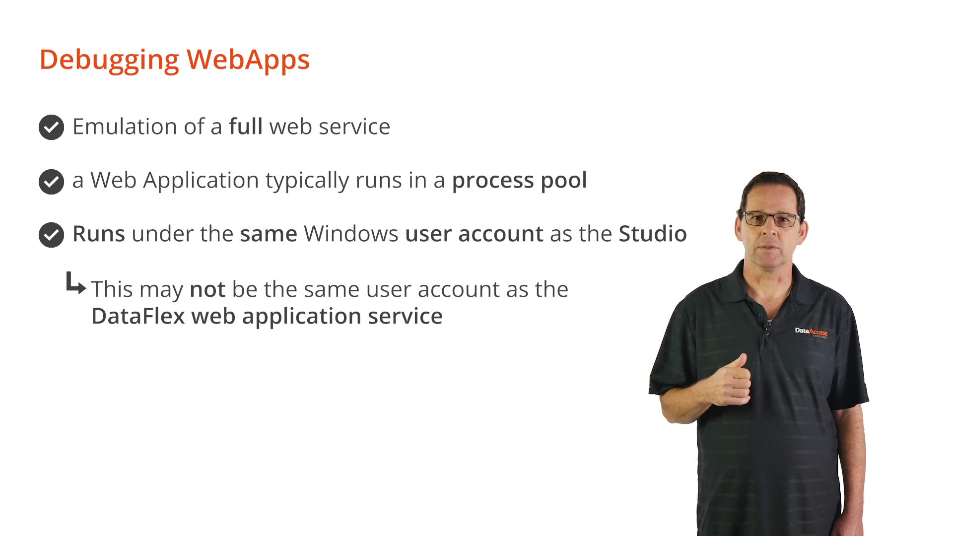 When running a web application in the debugger it is being run as an emulation of a full web service. A web application typically runs in a process pool where several processes are pre-loaded and take turns processing requests from the web client. Requests from the same WebApp session may connect to different processes. Debugging a WebApp runs as a single process, which means a process pooling environment cannot be completely emulated. Since the Debugger is part of the Studio, it runs under the same Window’s user account as the Studio. This may not be the same user account the DataFlex web application service runs under. As a result, access to databases and other files and locations that require permissions may not be the same as when the actual web application runs.