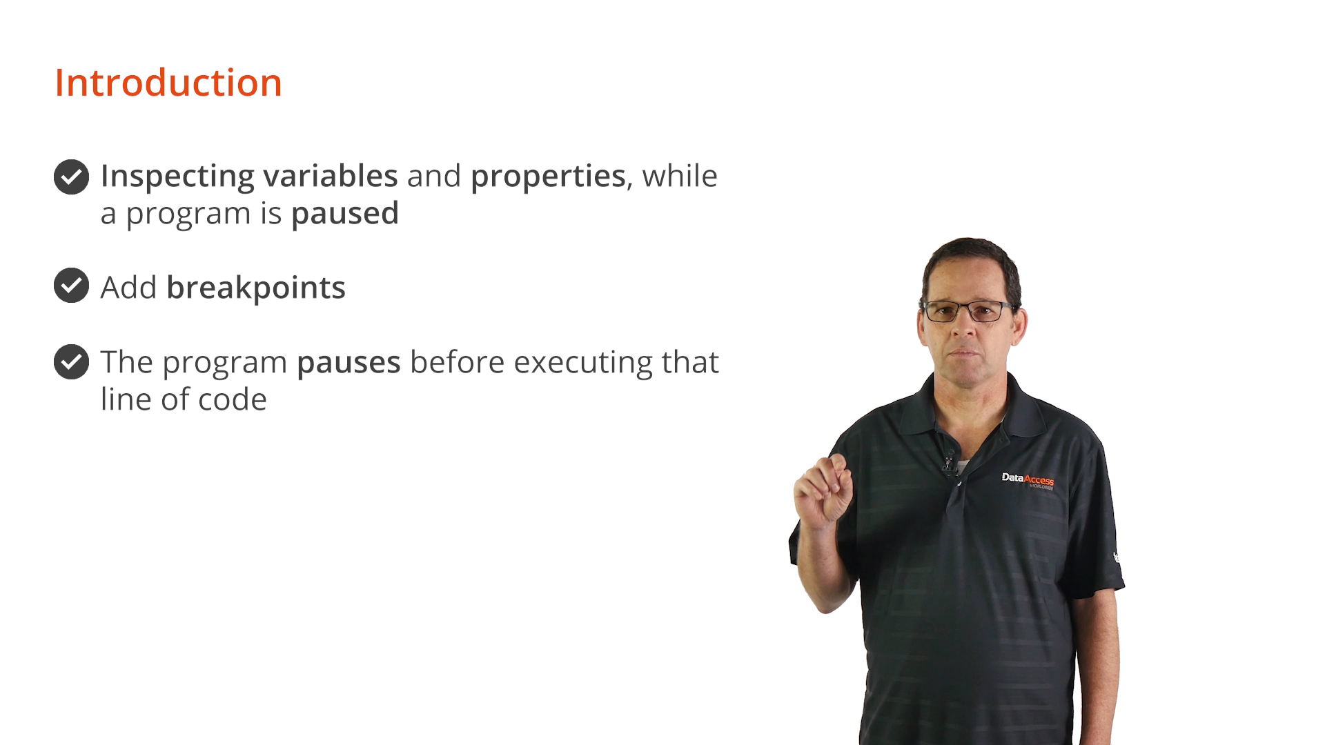 This course teaches how to use the DataFlex Debugger. The Debugger is part of the Studio that allows you to inspect a running program.