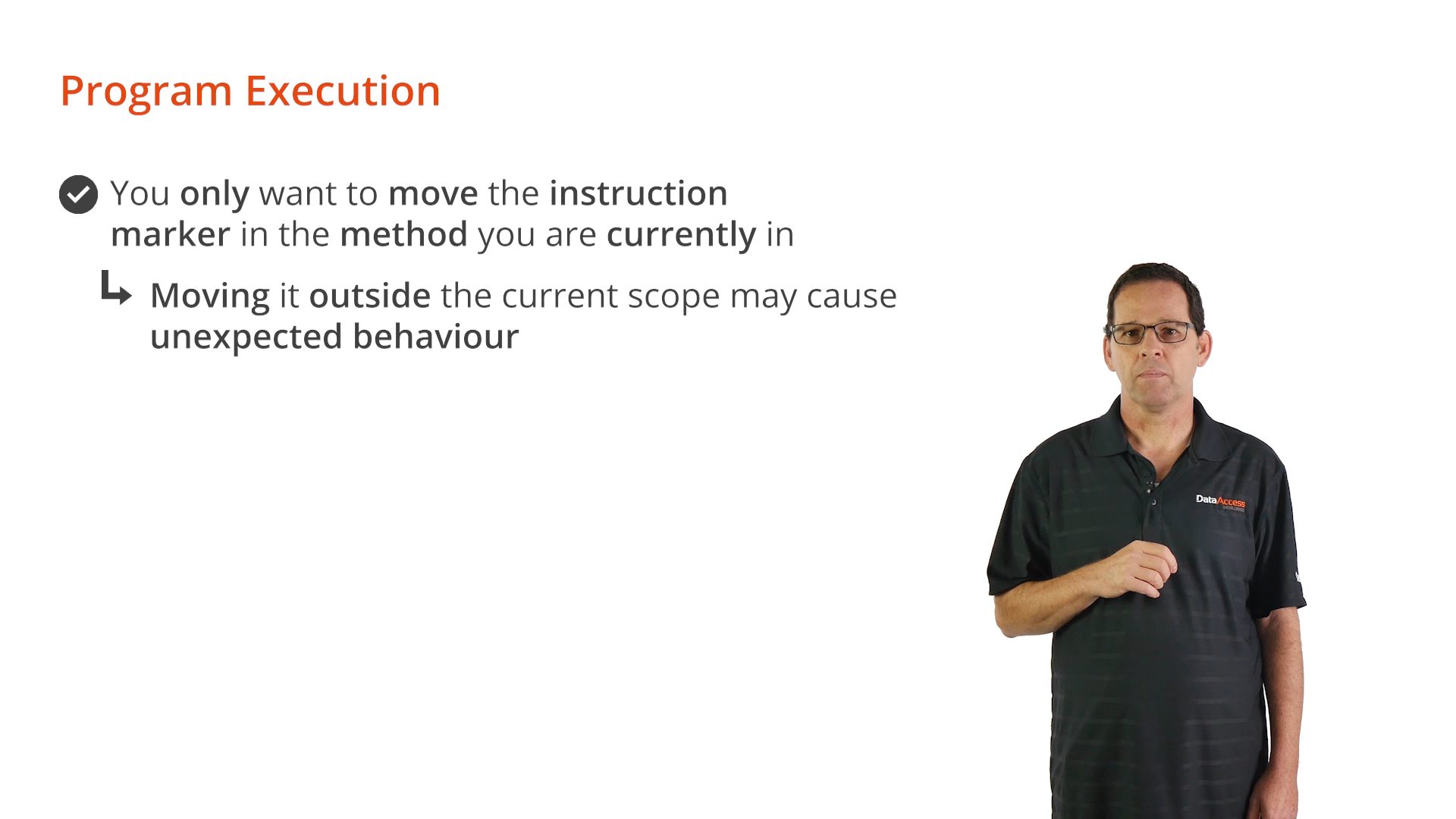- Typically, the instruction marker is only moved within the method currently being worked on because moving outside of the current scope may cause unexpected behavior