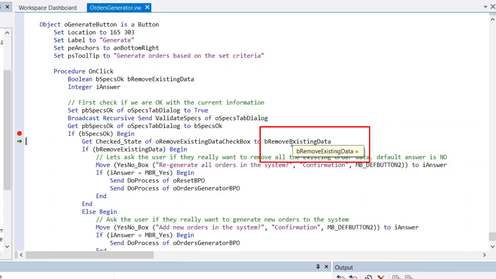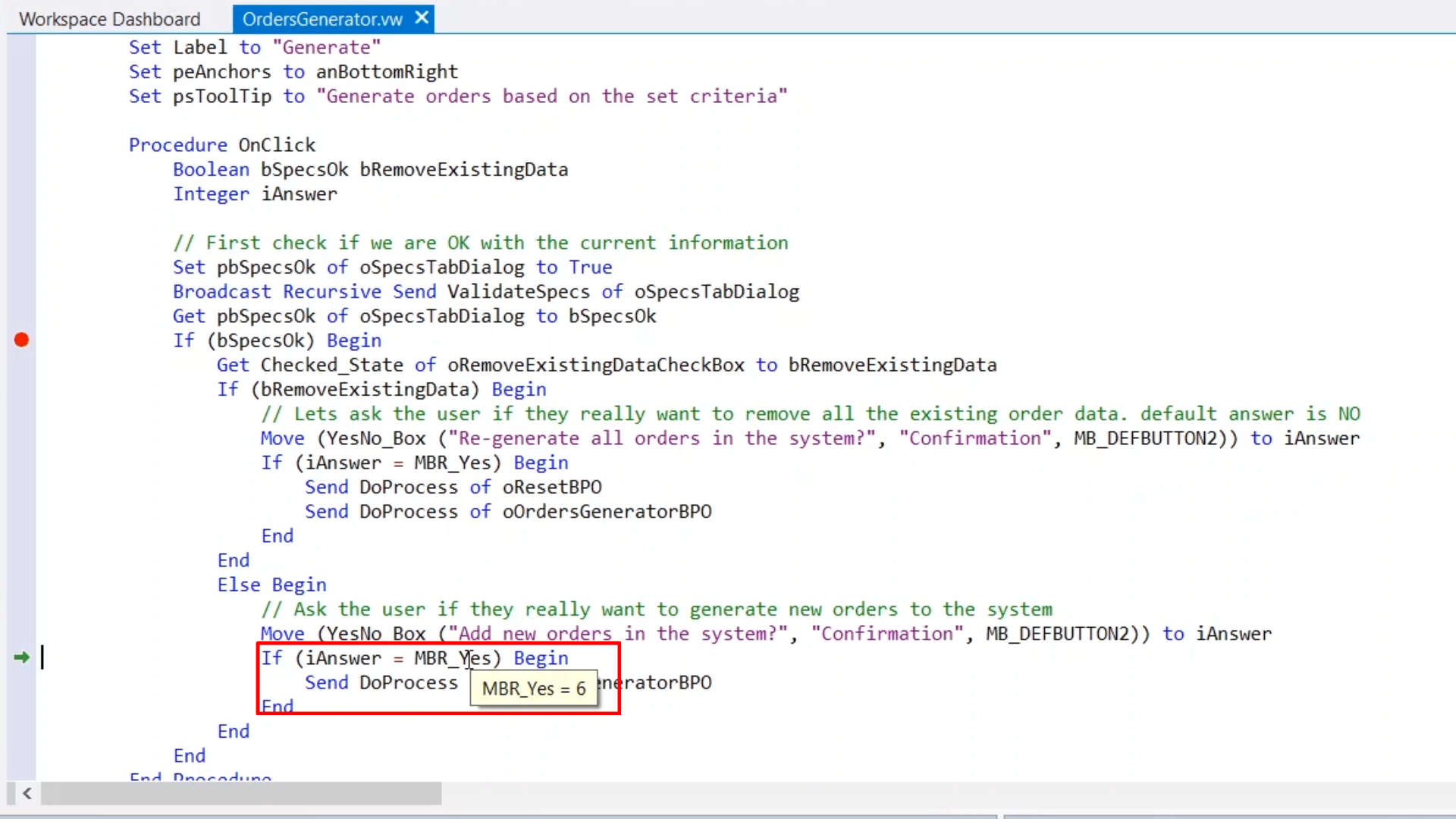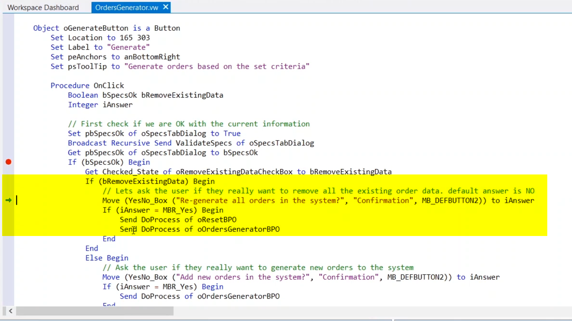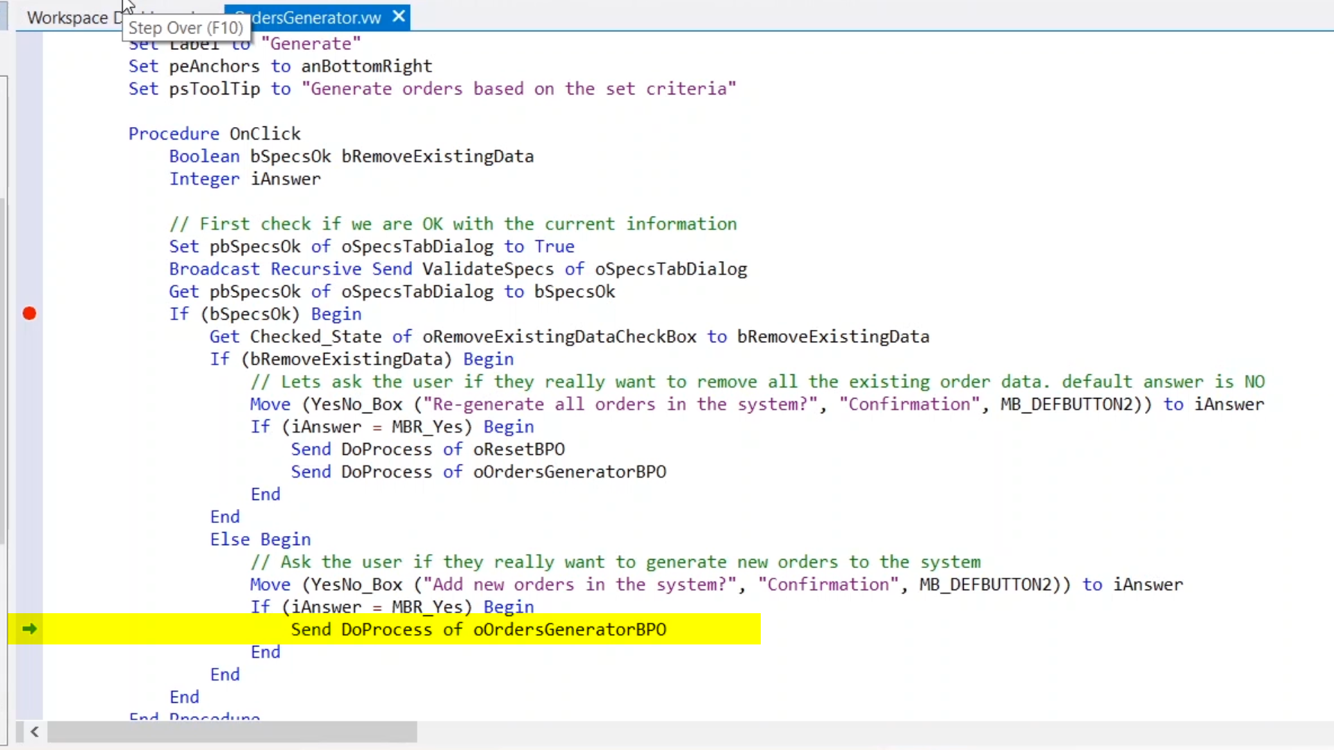 - Stepping over that line to execute the If statement to the next, which calls the DoProcess method of the oOrdersGeneratorBPO object