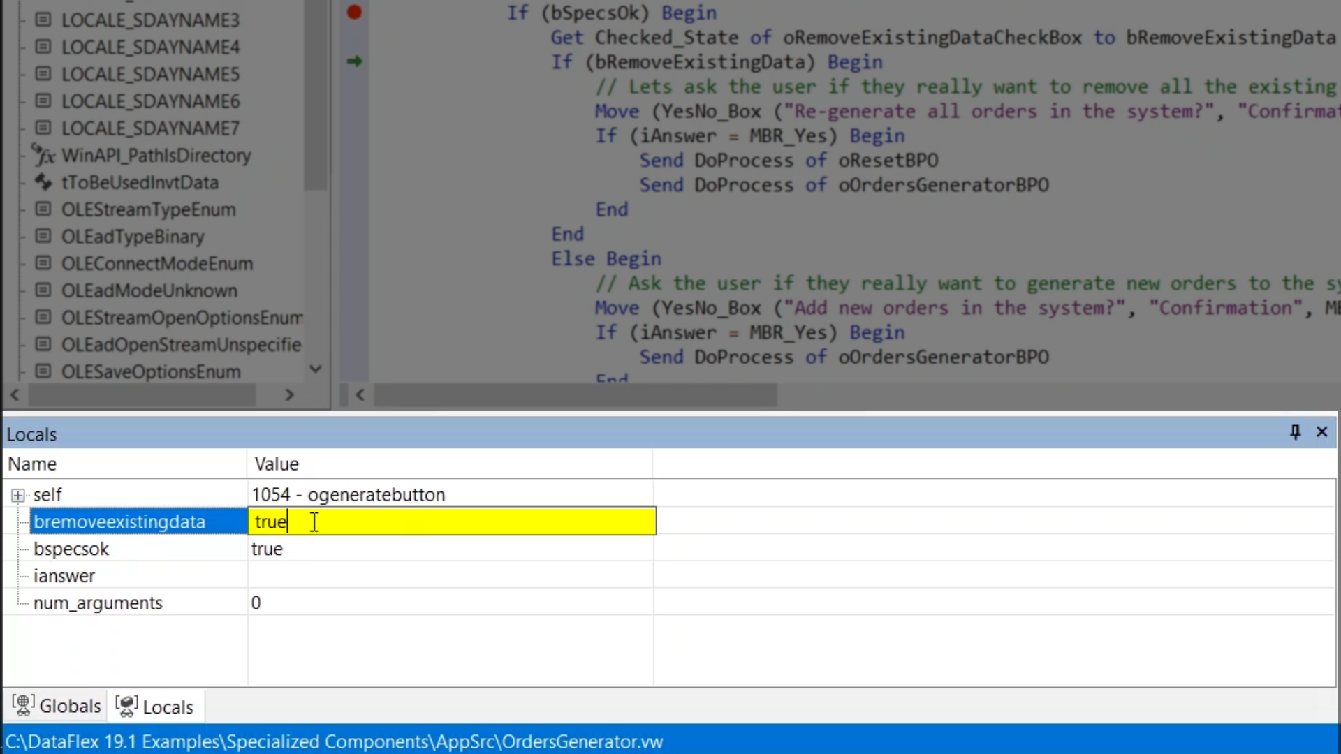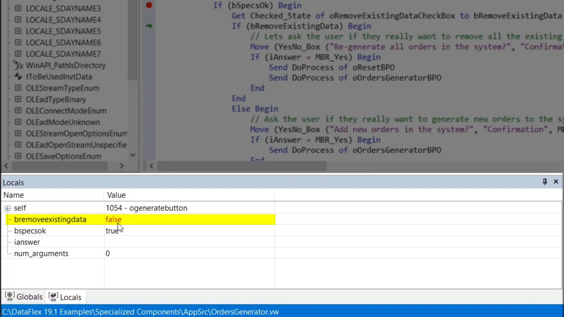 - In the Locals window, change the value of bRemoveExistingData back to ‘false’