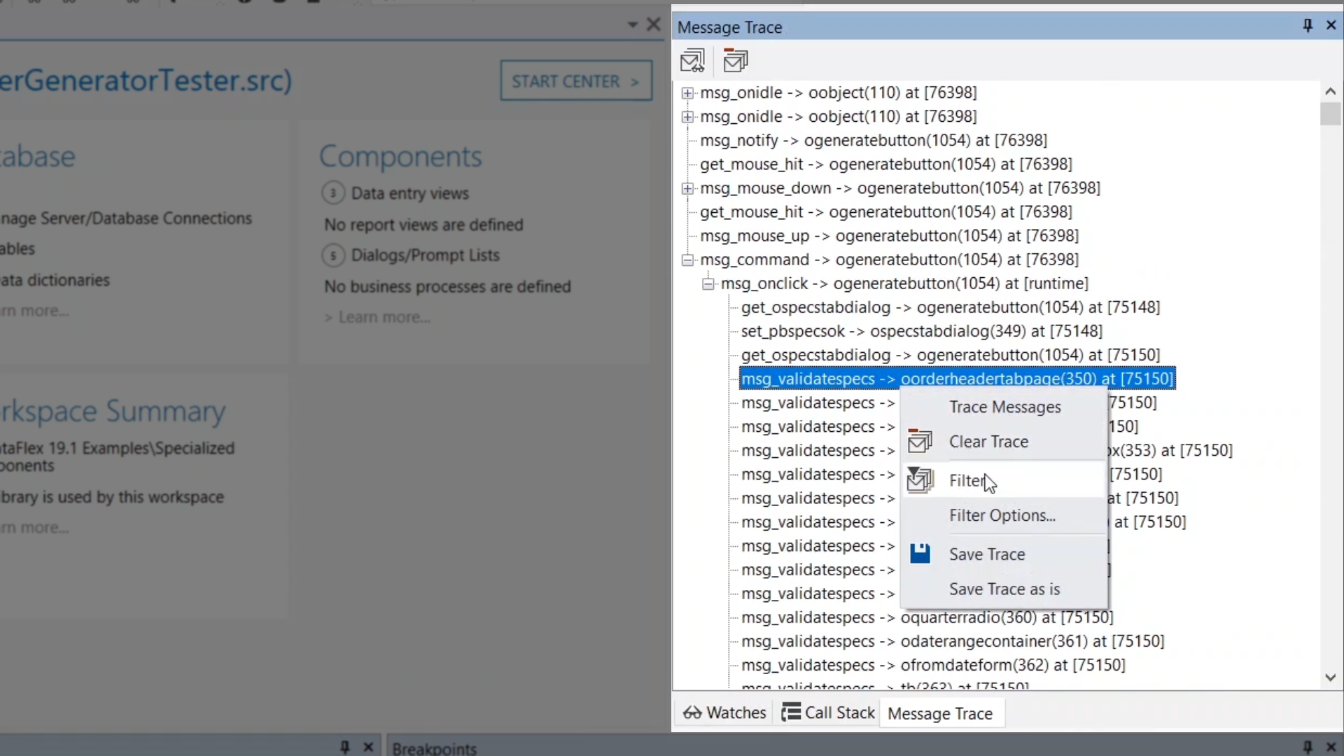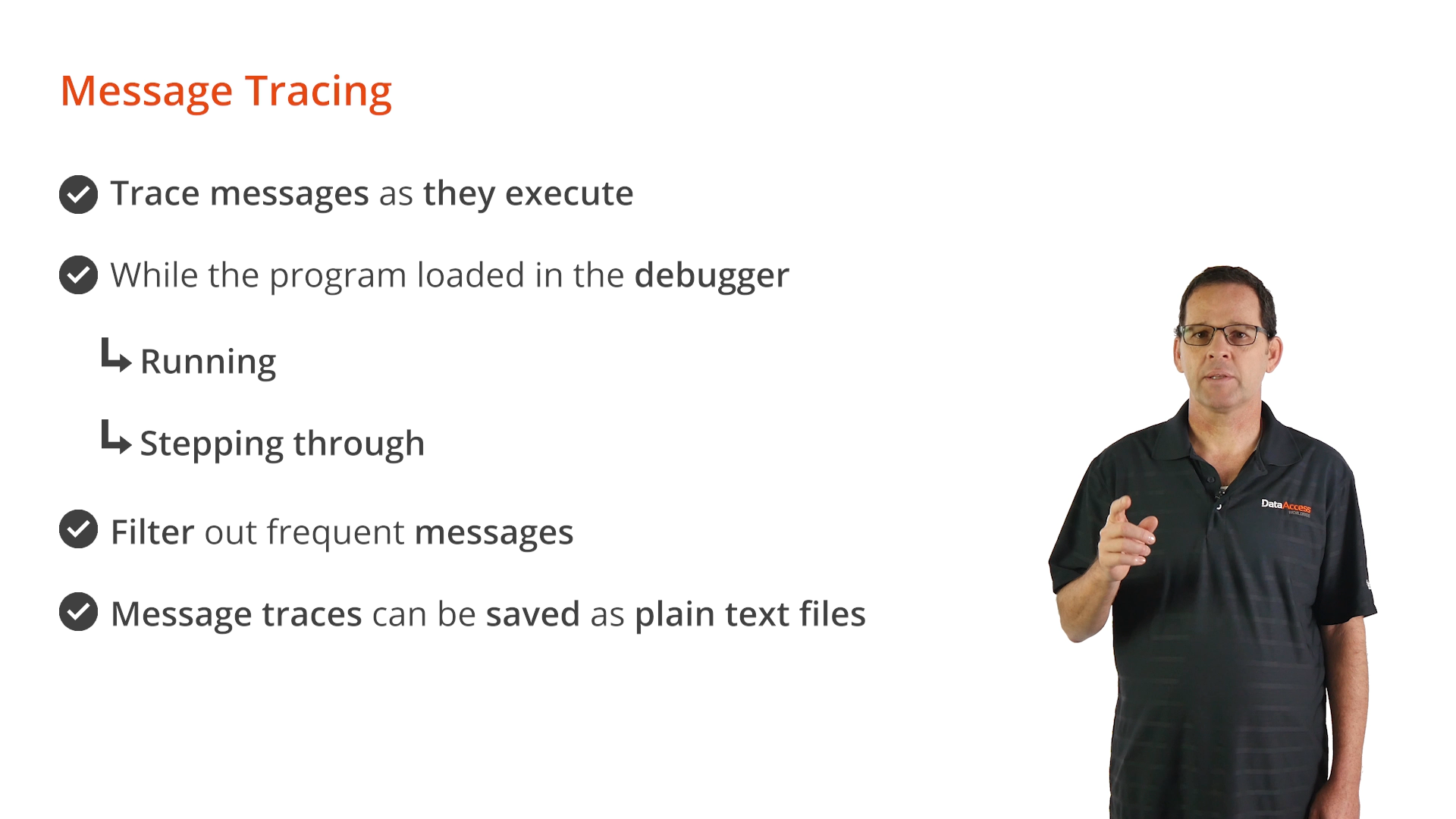 Messages can be traced as a program is executing both while running or being stepped through. Frequent messages can be filtered out to reduce unimportant messages and create a clearer trace. Message traces can be saved as plain text files.