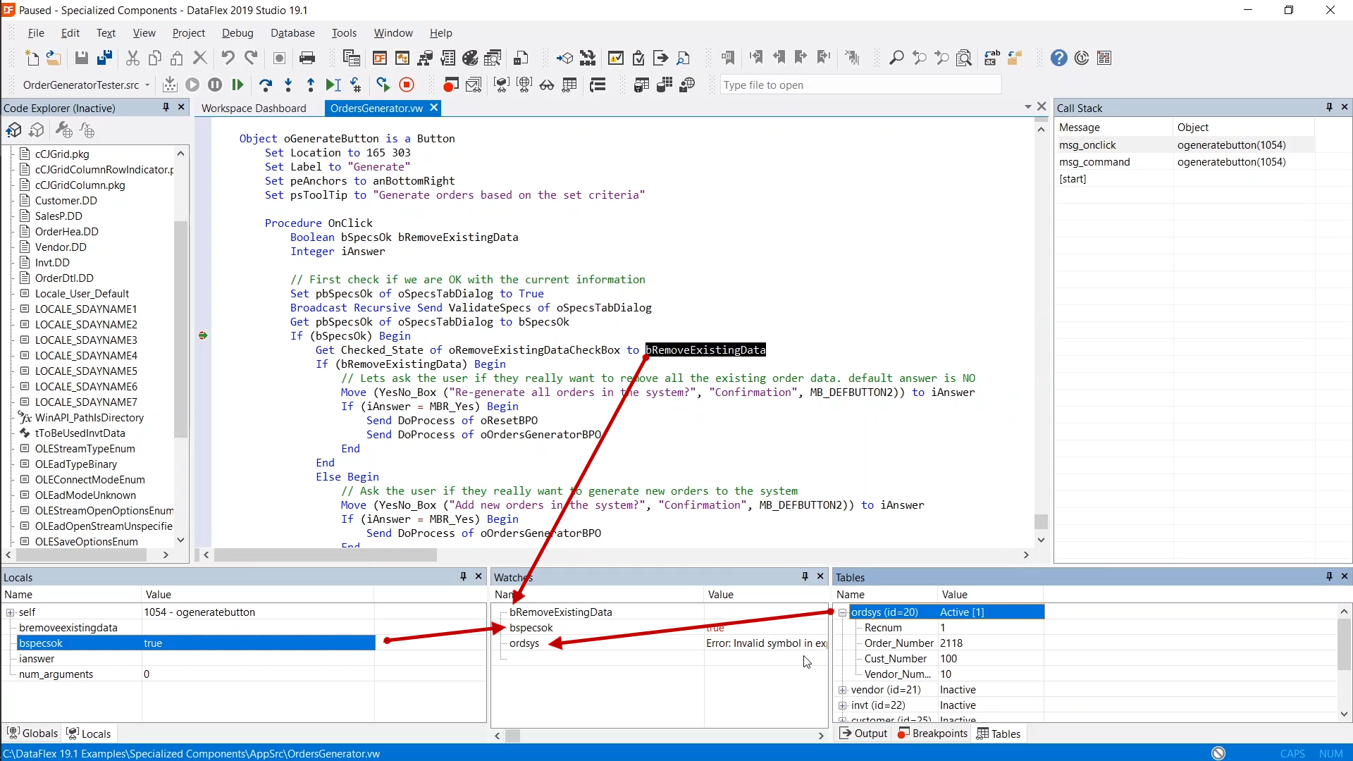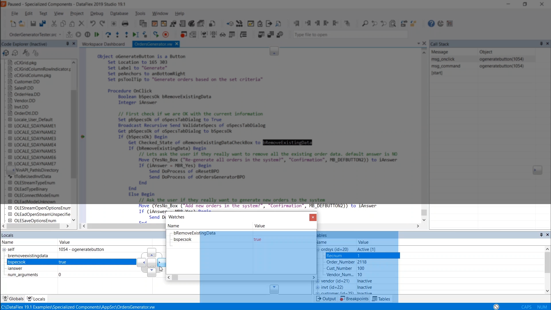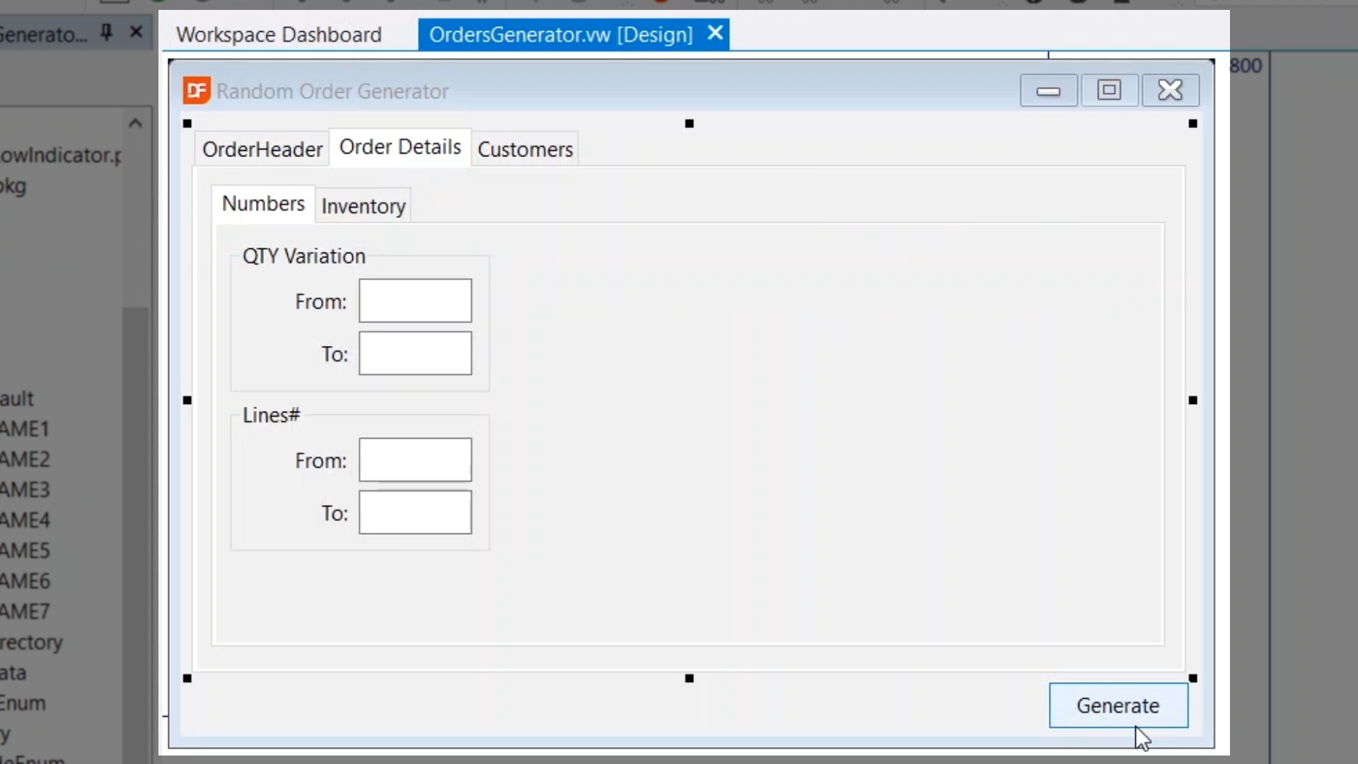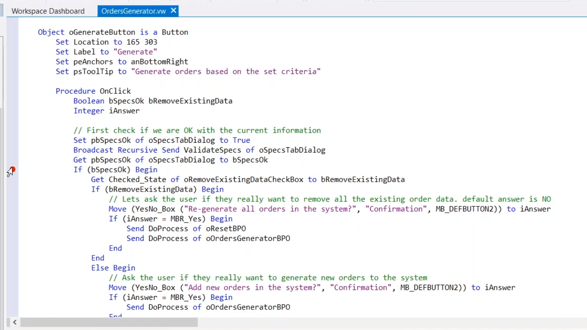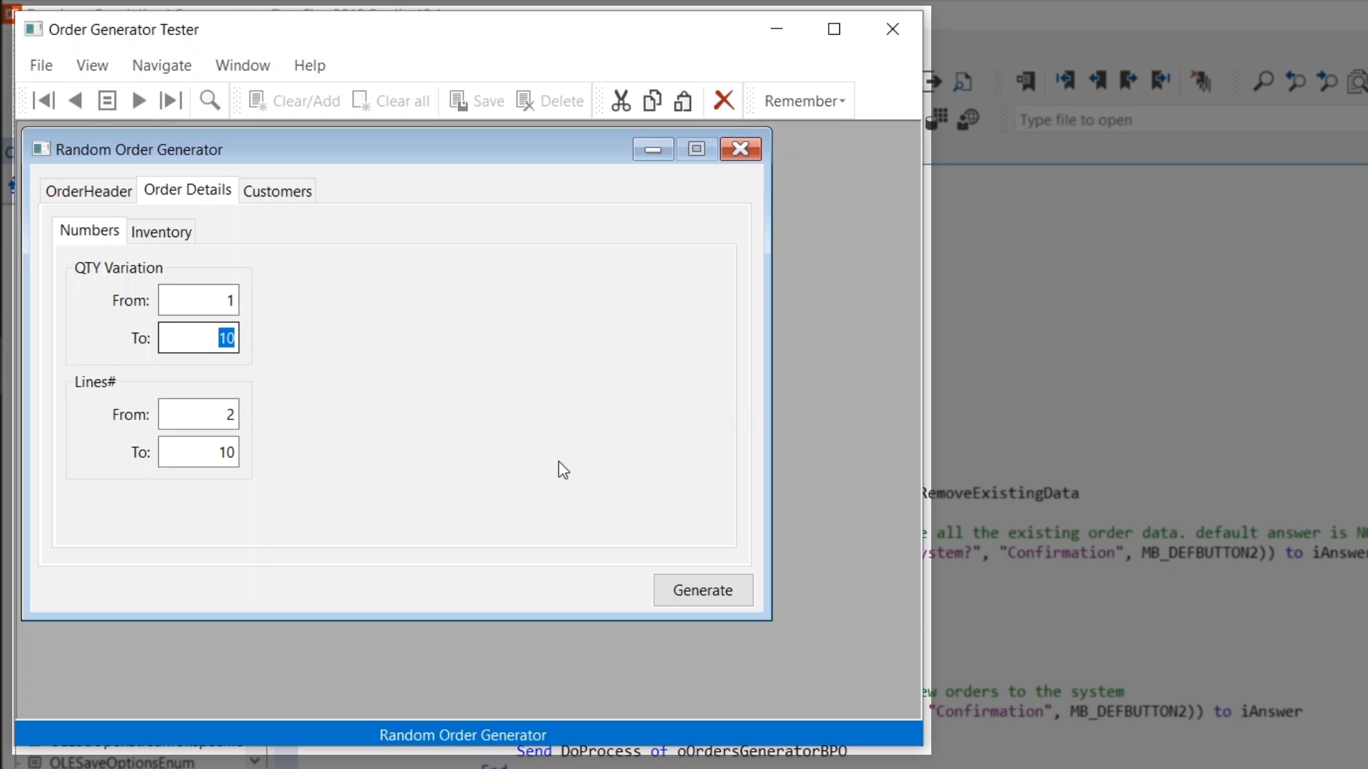 Debugging techniques will be shown by inspecting the code for the ‘Generate’ button that is part of the ‘OrderGenerator.vw’ view.