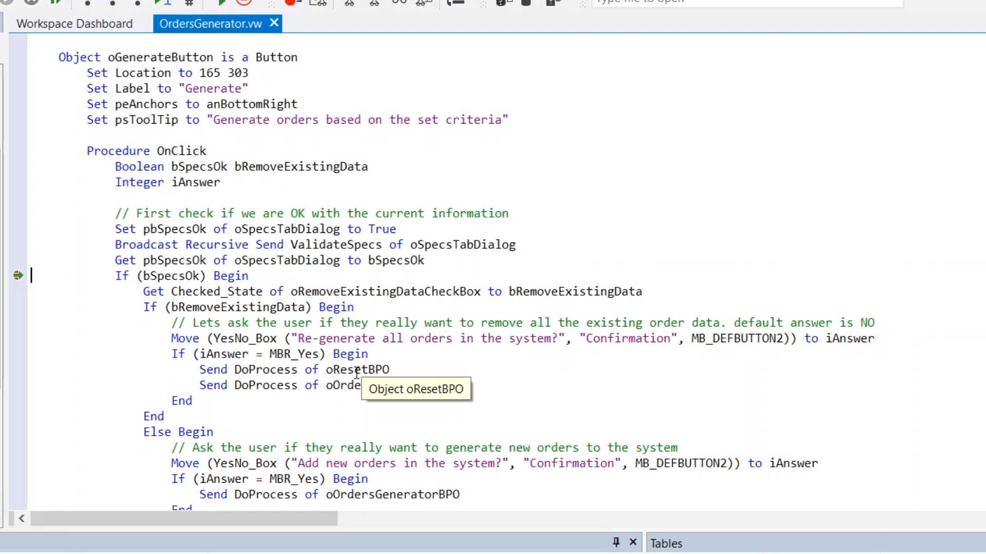 Double click on the ‘Generate’ button to open the Code Editor to that object