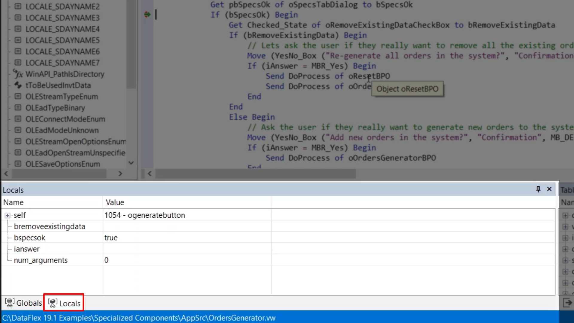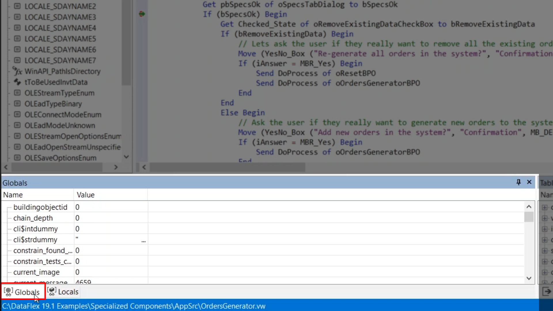 The ‘Globals’ window shows all of the predefined variables from the DataFlex packages. These are rarely used.