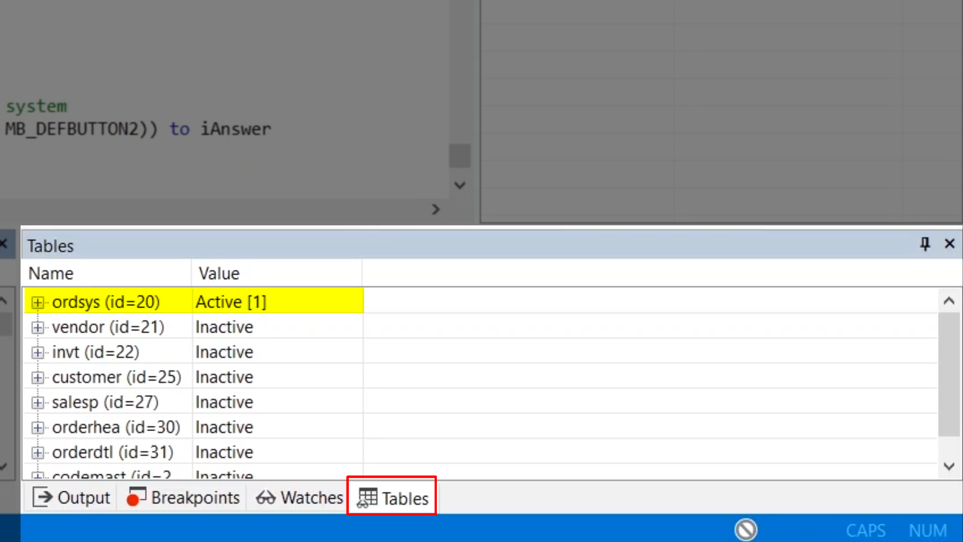 Currently, ‘ordsys’ is the only active table. The is because it is a system table, and system tables always have their one and only row loaded in the global table buffer.