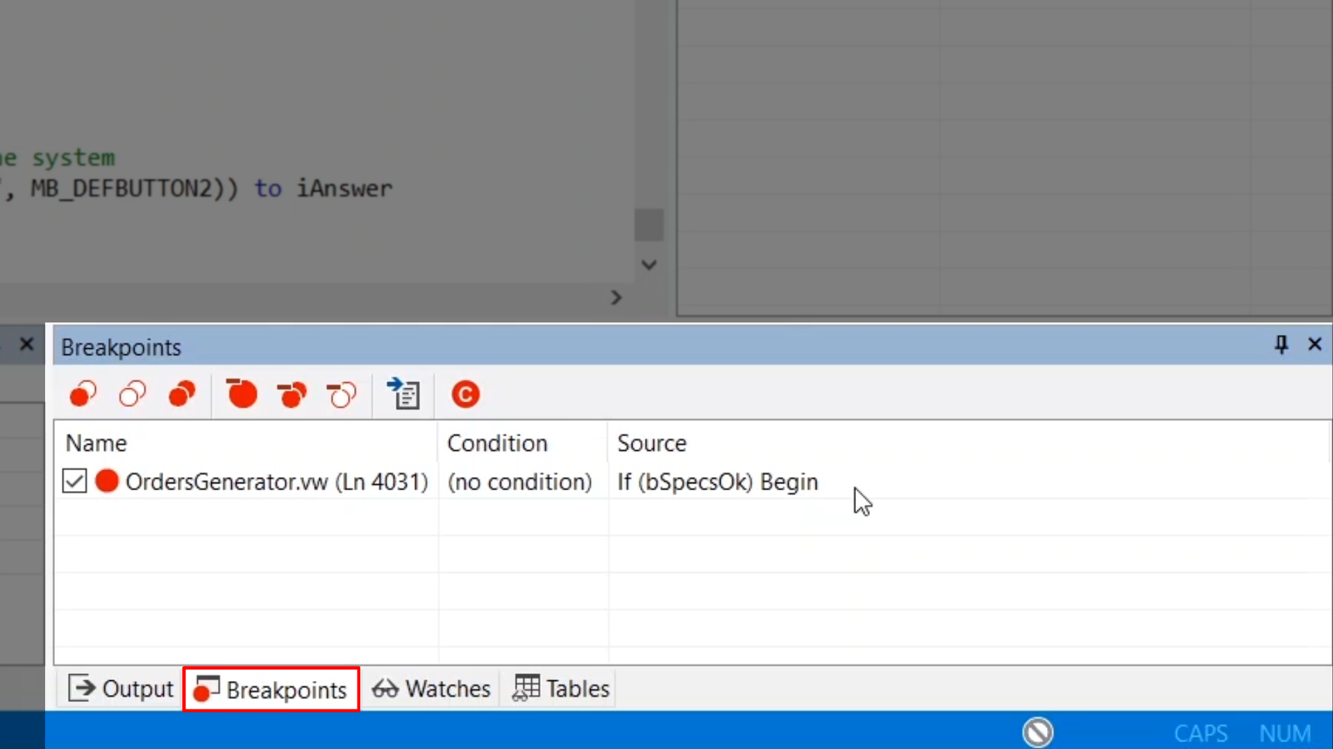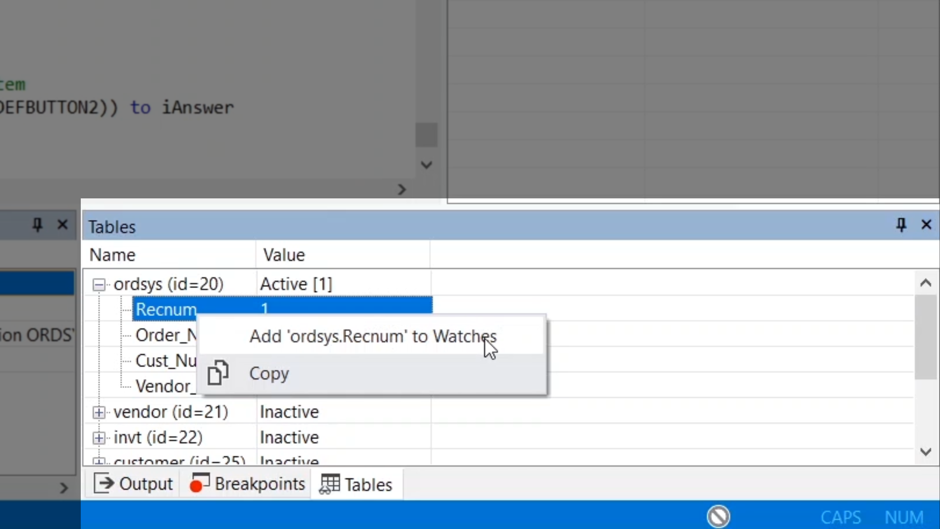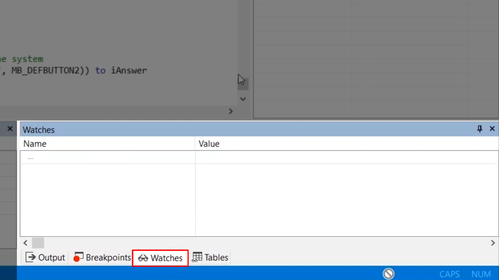 A variable can be dragged from the Code Editor, the ‘Locals’ window or the ‘Tables’ window into the ‘Watches’ window