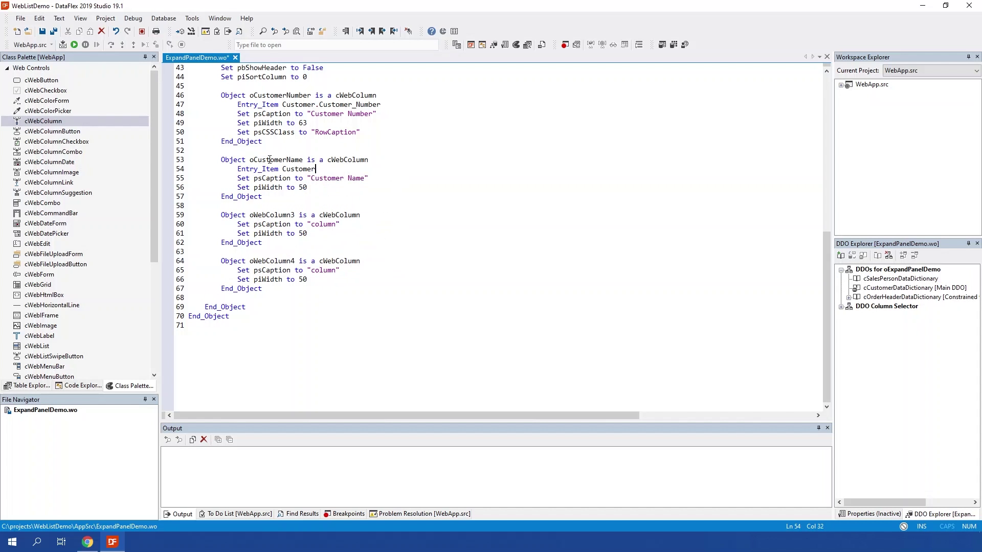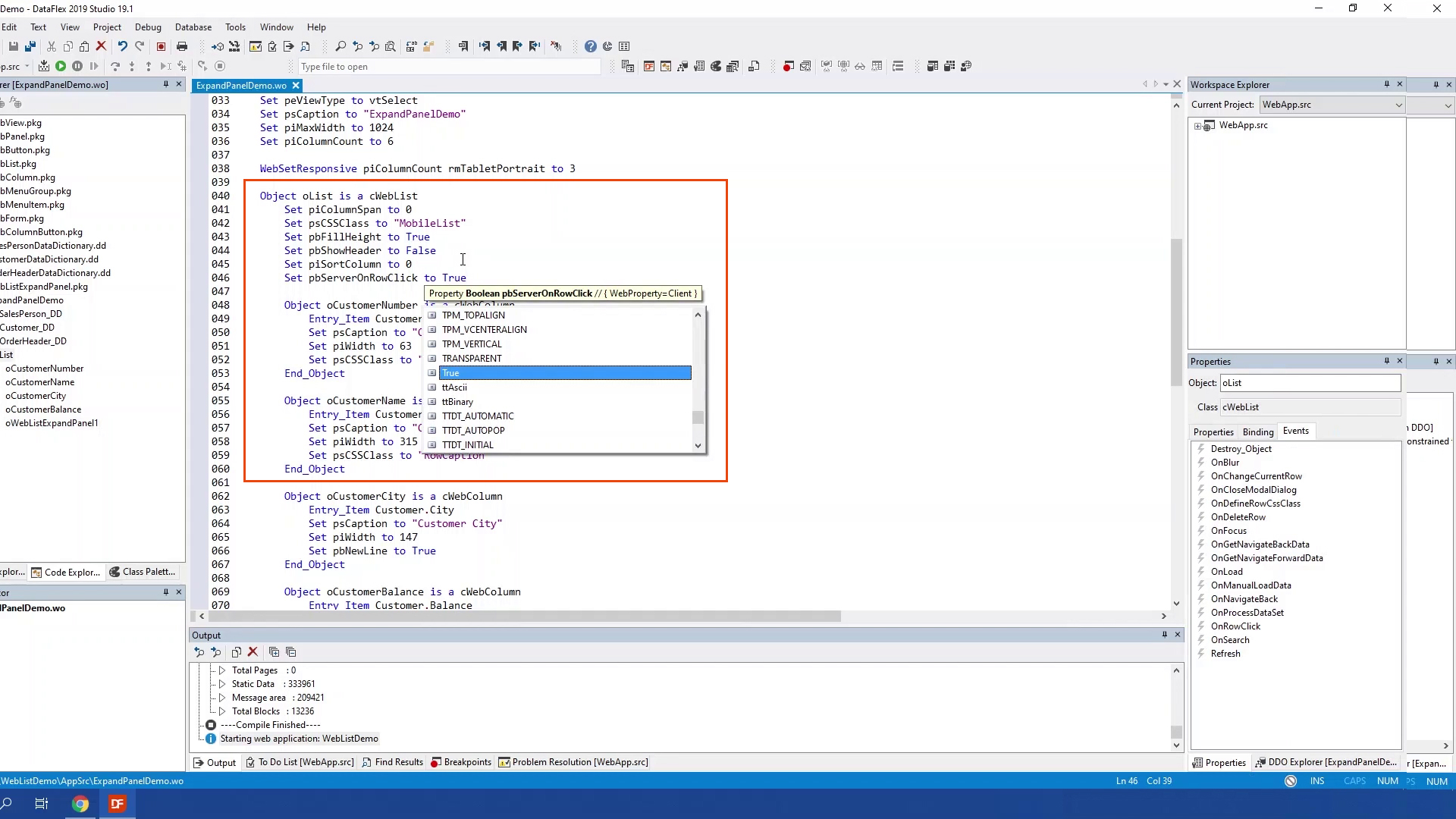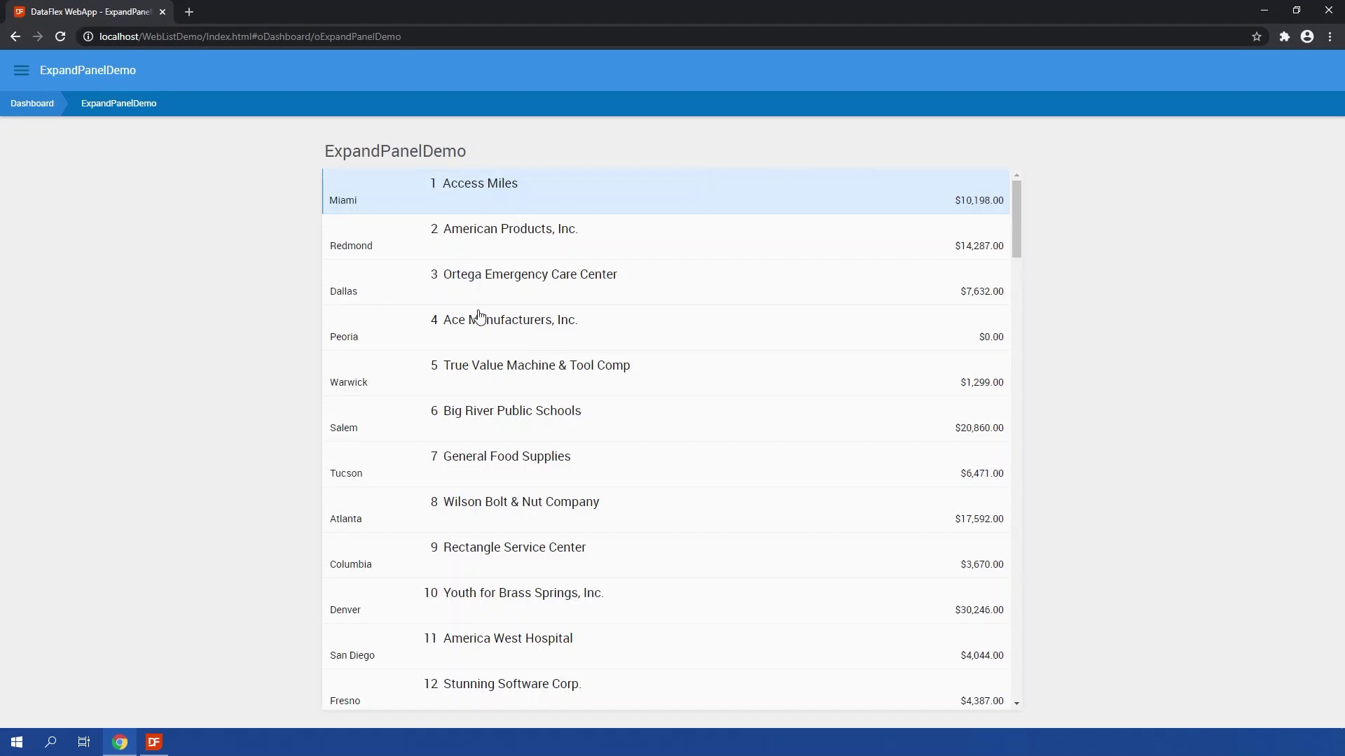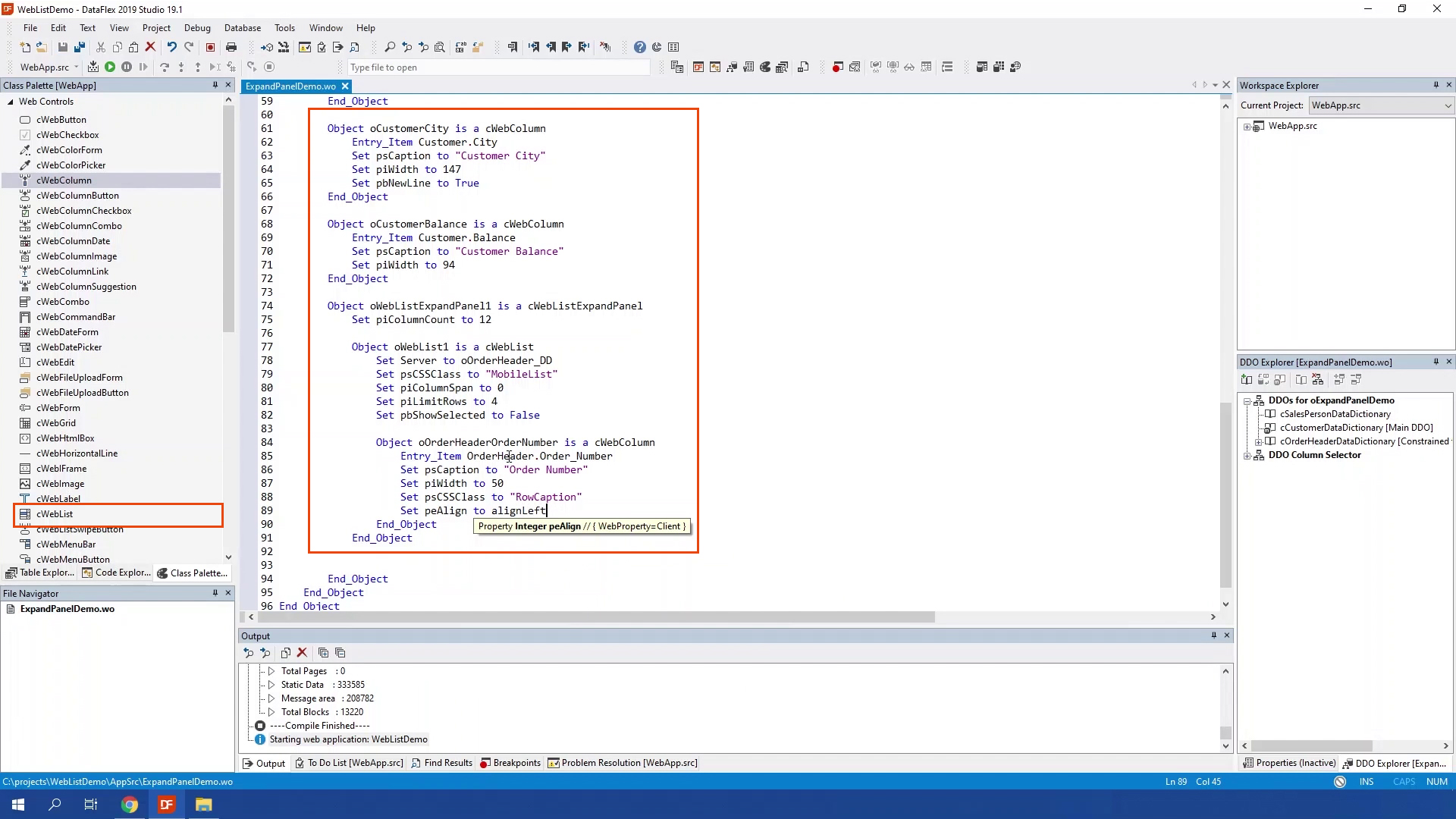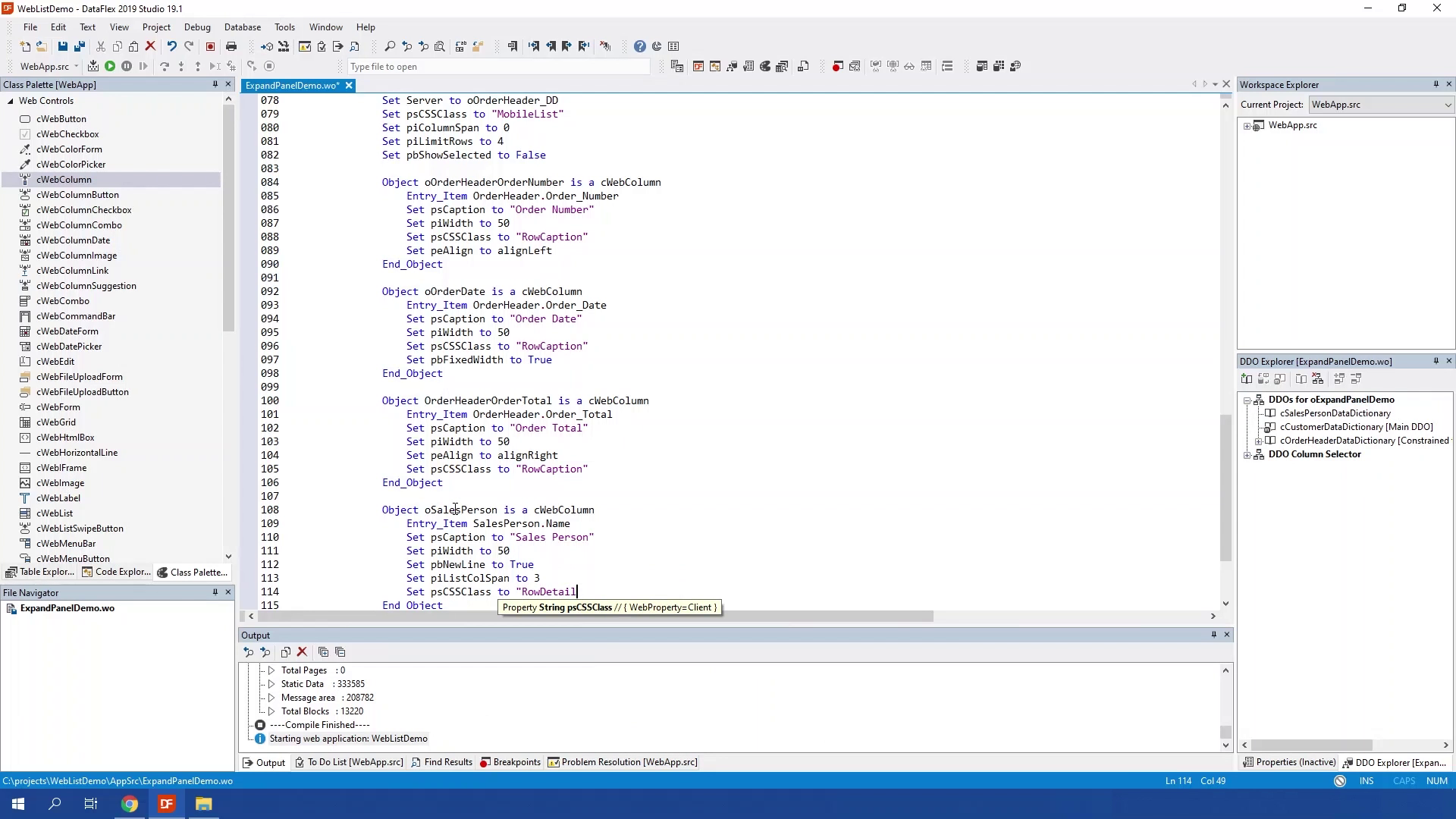 The WebListExpandPanel is a panel that can be expanded with a row click. In the panel you could show more info about the row. The WebListExpandPanel should be a direct child of a weblist which means it needs to be in side of the Weblist object. The panel expands and collapses based on the property peMode. peMode can be set to different values, It can be set to wleOpenOnRowClickCloseOnChange which is set be default. This will opens the row that has been clicked and closes when changing the current row or clicking another row. Or it can be set to wleOpenOnRowChange this will open the current row as soon as it changes. It can also be set to wleOpenOnRowClick, this will open the current row when it is clicked, as this will only close until another row is clicked. Or it can be set to wleManual which will not open or close manually. Open and closing is done by sending ExpandRow or Collapse.