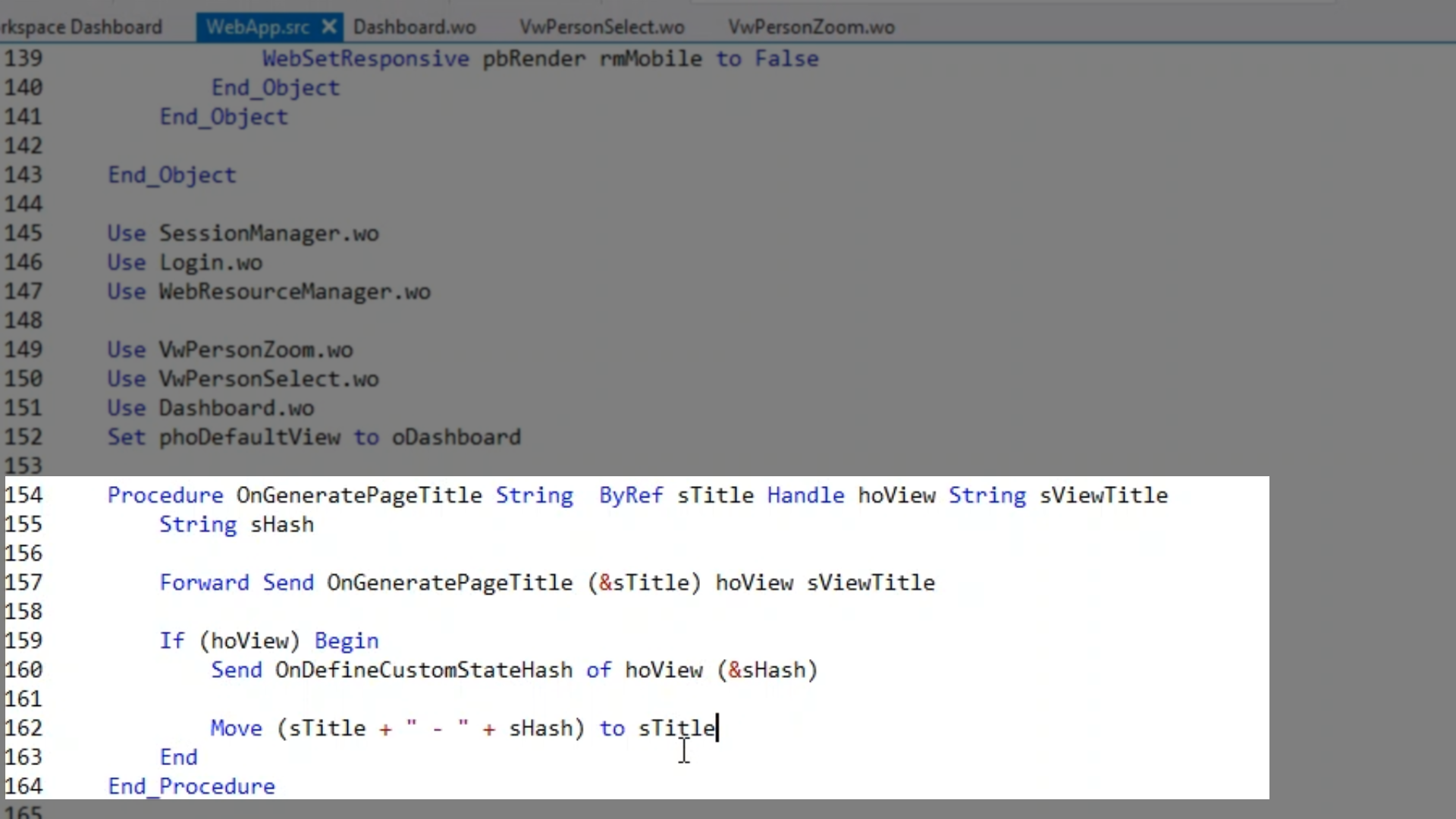 From the WebApp source, implement the OnGeneratePageTitle. Inside, write code to take the custom StateHash and append it to the page title.