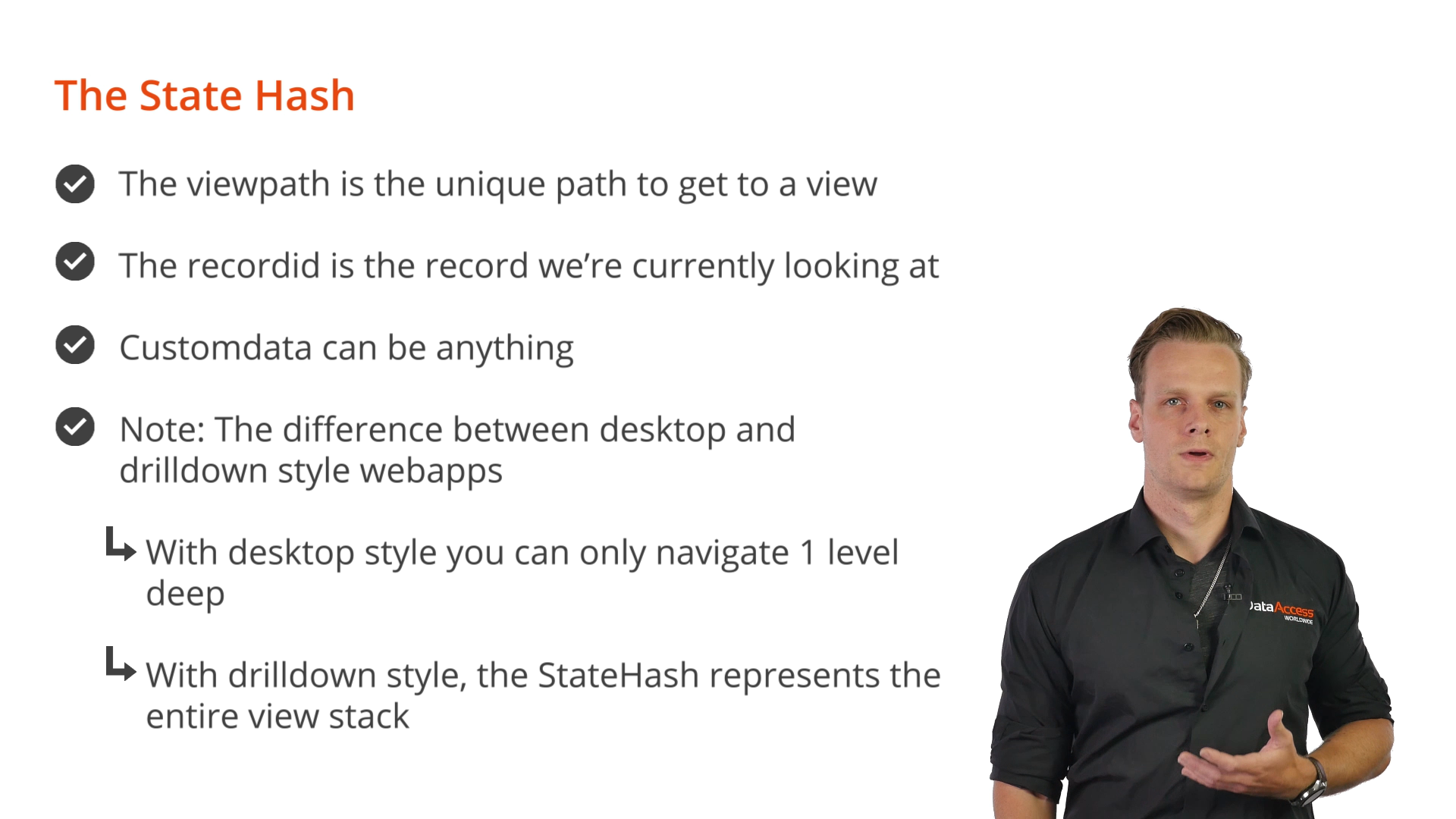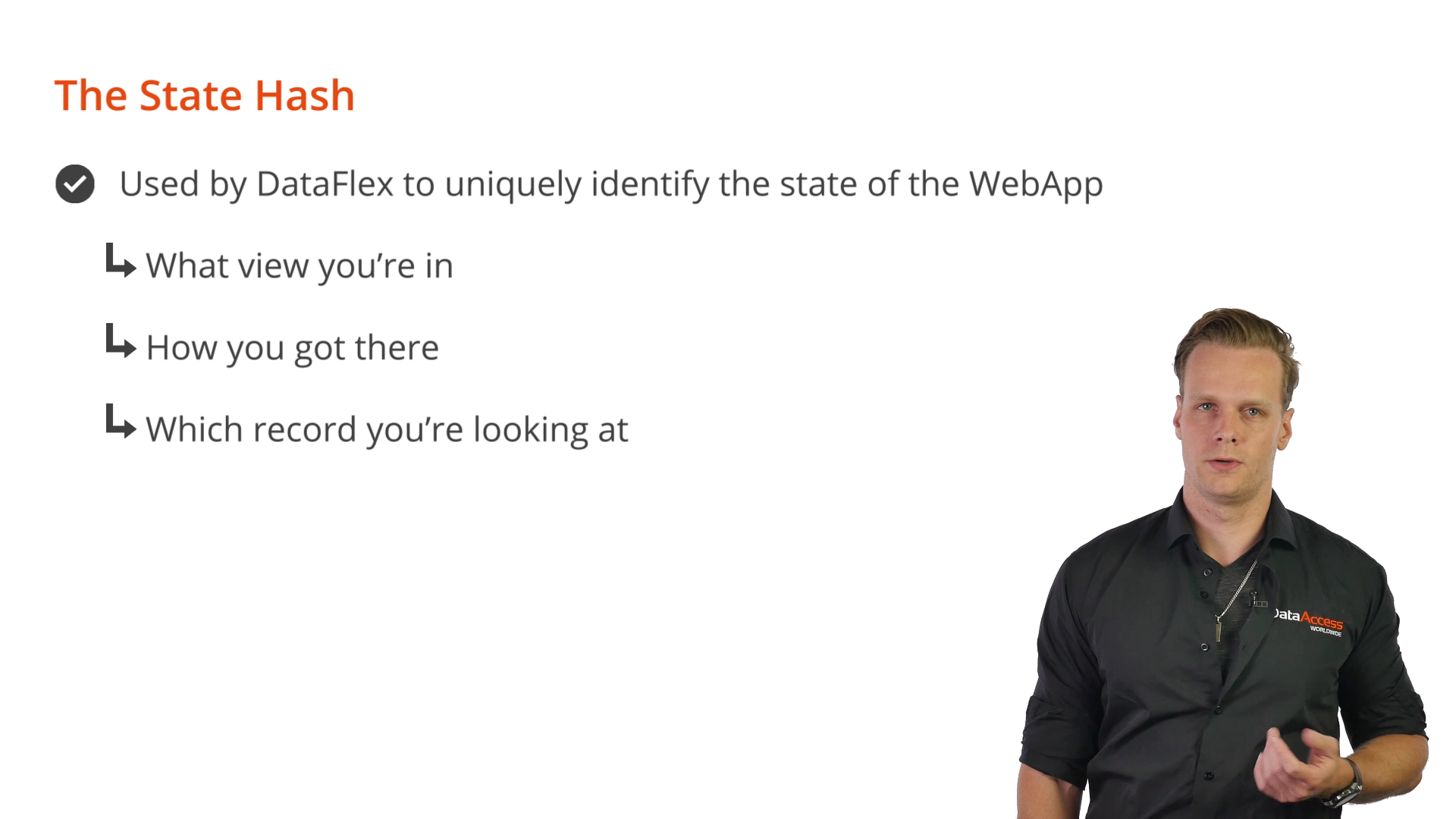 The StateHash is one-of-two important components of DataFlex History Management. It is used by DataFlex to uniquely identify the state of the WebApp. It indicates which view is being shown, the path taken, and which record is currently in view.