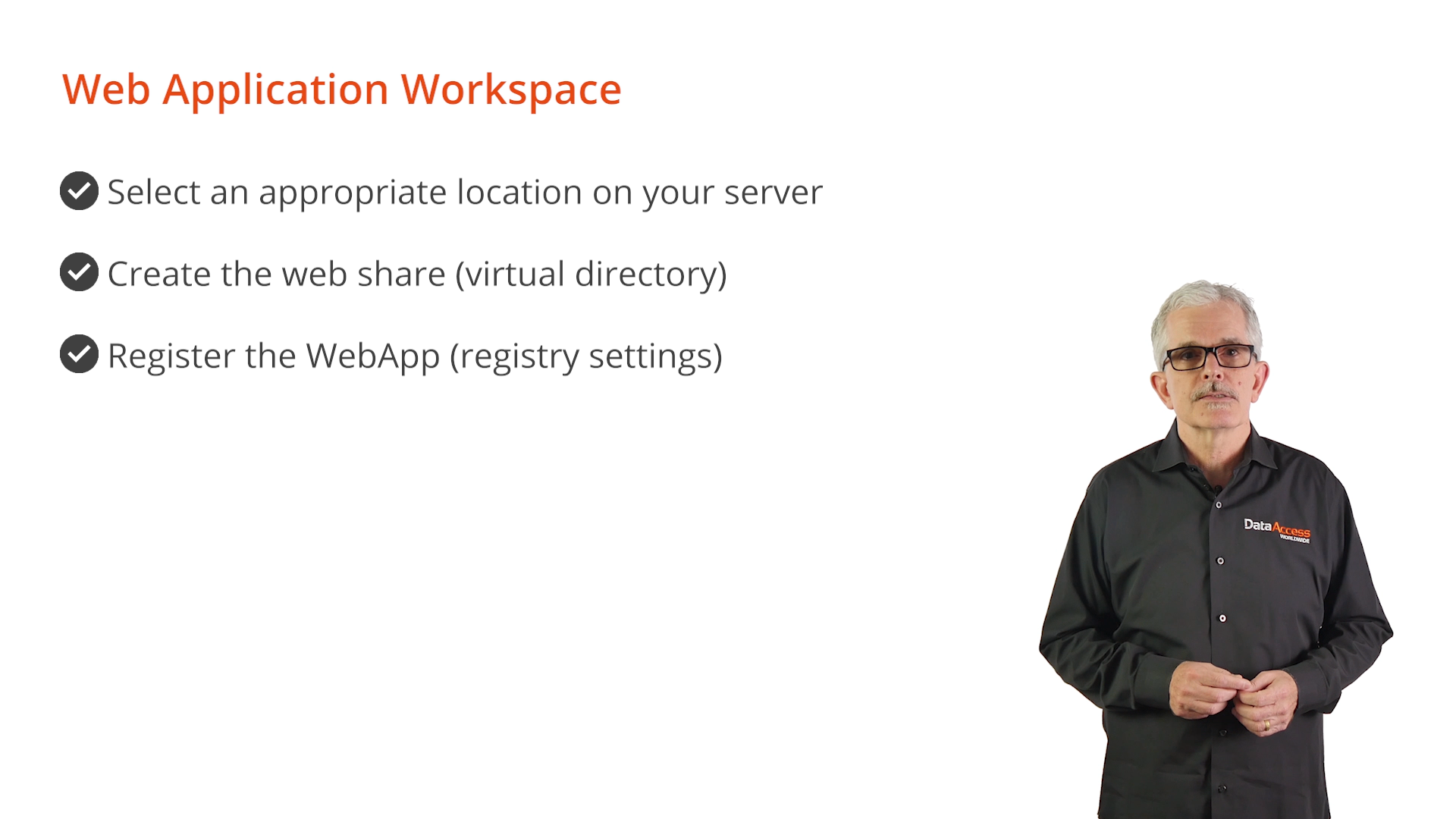 The script or installer will place the deployment workspace in an appropriate location based on the server configuration. It’s important that the destination is in a shared location on the server that will be accessible by any network users and also the system account that runs the server service. Once the workspace location is known, the WebApp must be registered with both IIS and the DataFlex WebApp Server. This is a two-step process because the Administrator is not being used.