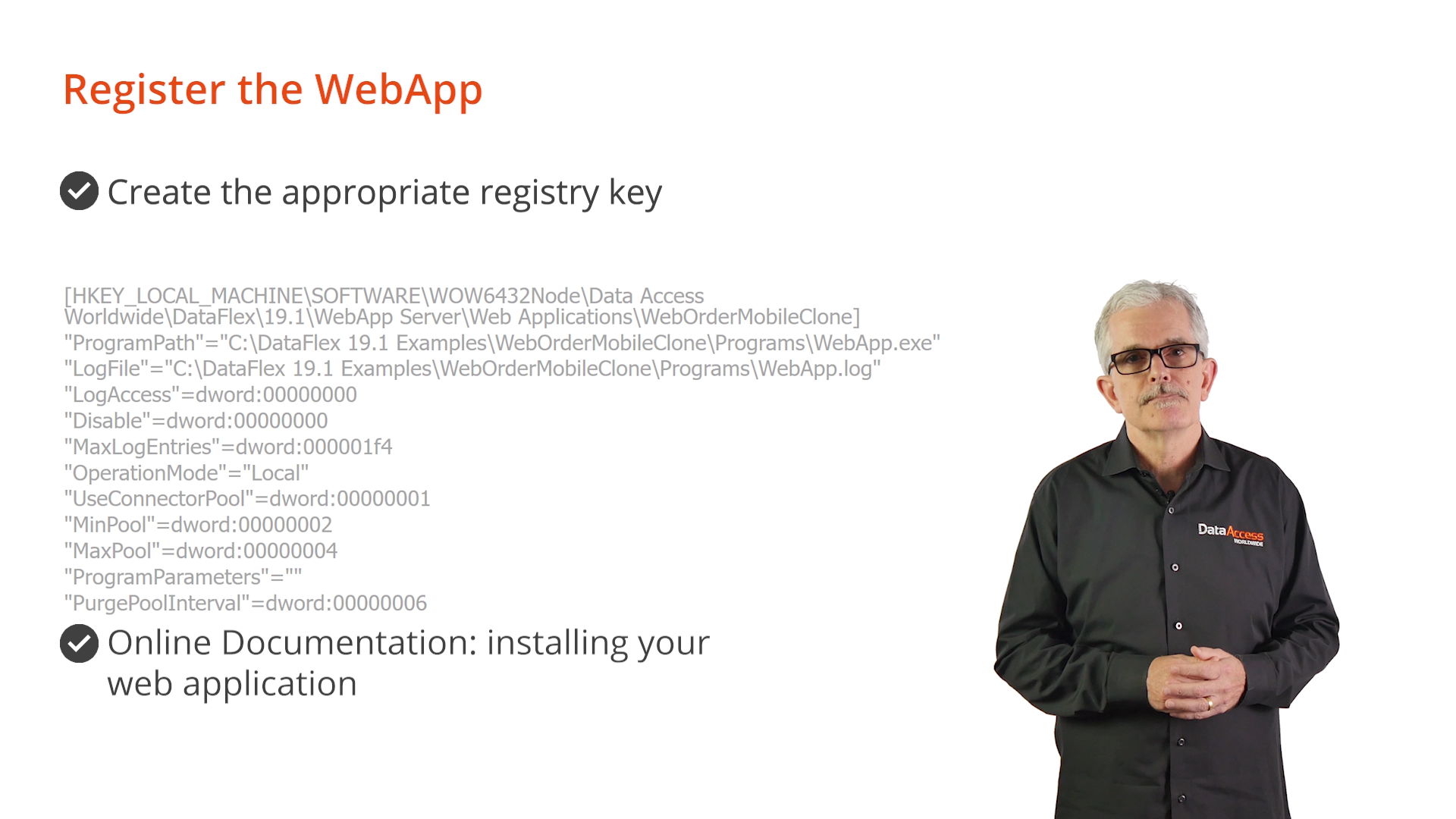 The last action to be taken is to register the web application with the server. This is done with registry entries that control all the options that would normally be set using the Administrator. An existing registry block can be imported or the installer can be used to set them. The example shown would set up our WebAppMobileClone with the same settings chosen in Lesson 3.