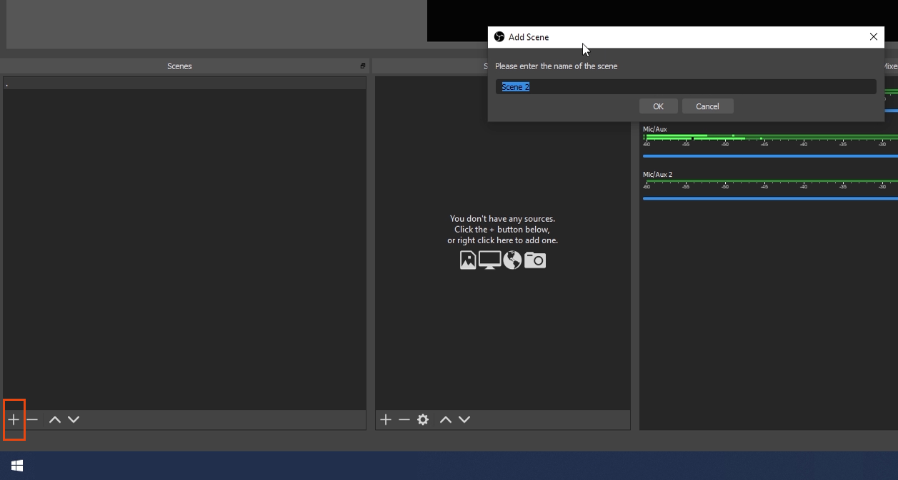 - Click on the plus icon in the Scenes Panel