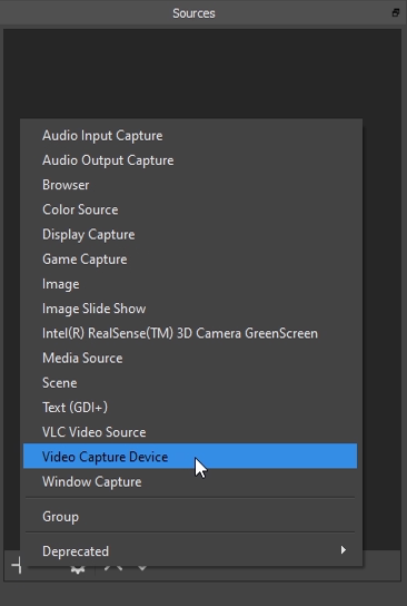 - Select the scene and click on the plus icon in the Source Panel. Because we want to add the feed of our camera we choose 'Video Capture Device'