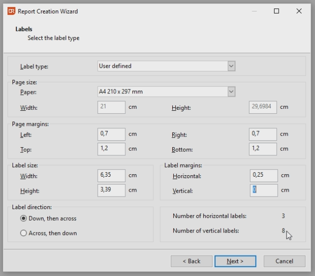 Define the values of the Label Reports. In this example: - Page margins Left: 0.7 cm - Page margins Right: 0.7 cm - Page margins Top: 1.2 cm - Page margins Bottom: 1.2 cm - Label size Width: 6.35 cm - Label size Height: 3.39 cm - Label margins Horizontal, 0.25 cm This screen of the wizard also shows how mow many labels will fit a page. In this case 3 x 8.