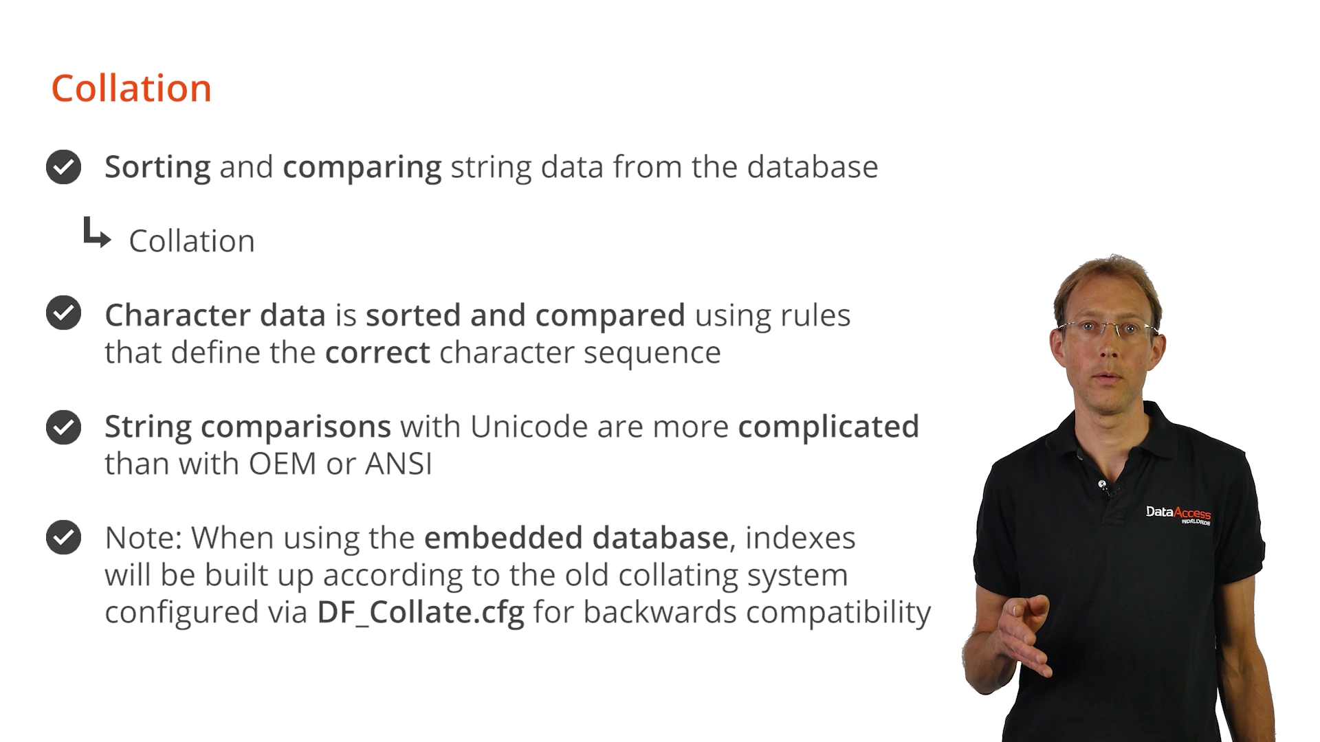 Note that when using the embedded database, the indexes will be built up according to the old collating system configured via DF_Collate.cfg for backwards compatibility.