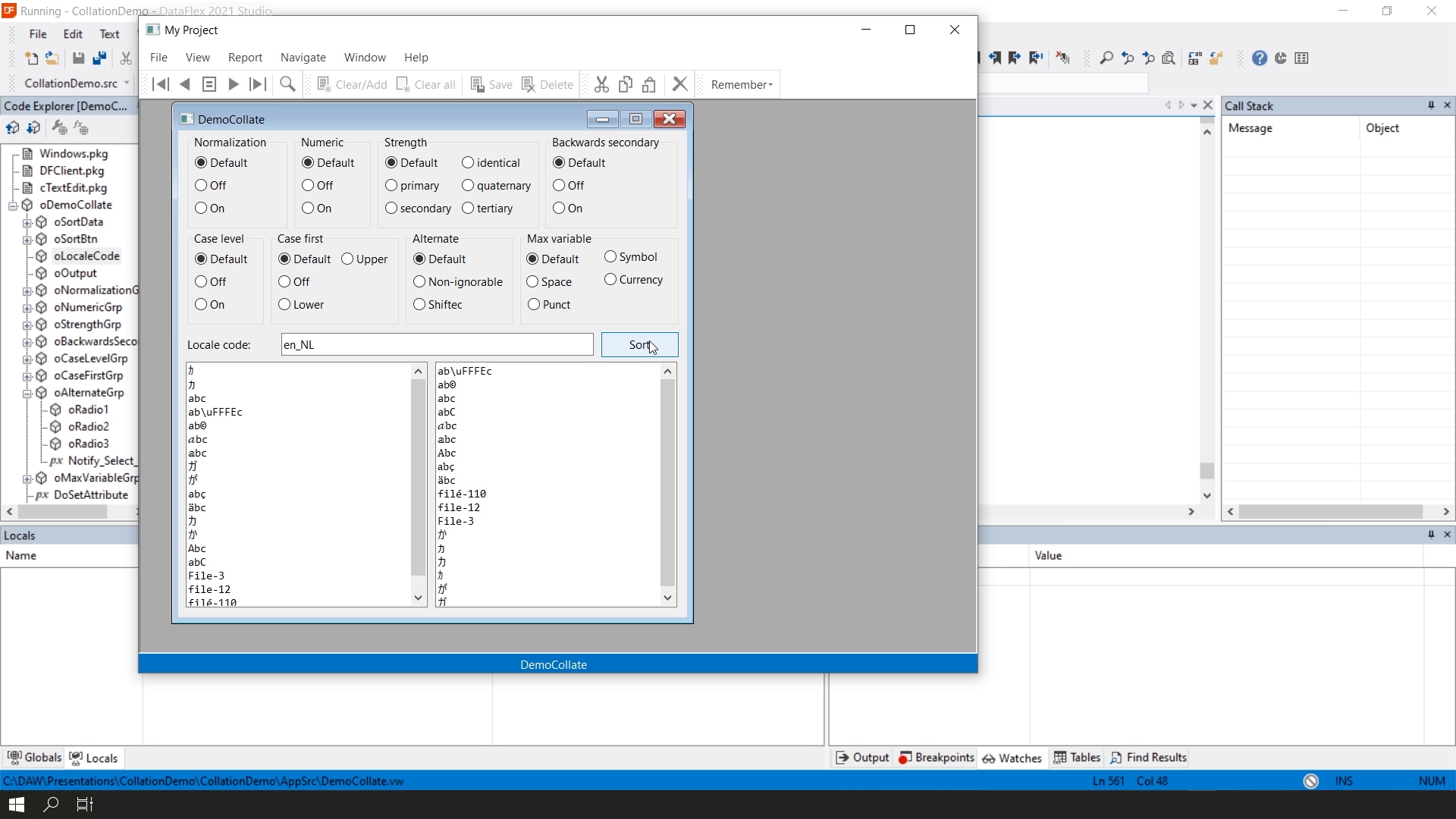 This lesson we will look at sorting and comparing string data from the database, otherwise known as collation. Character data is sorted and compared using rules that define the correct character sequence, with options for specifying case-sensitivity, accent marks, etcetera.String comparisons with Unicode are much more complicated than with OEM or ANSI. DataFlex 2021 uses the ICU Library for comparing strings according to the Unicode standards. ICU is a cross-platform Unicode based globalization library. Multiple collations are supported and can be configured via the new DF_LOCALE_CODE string attribute. This global attribute defaults to the language of the operating system and can be changed at runtime. This website for the available locale codes: http://userguide.icu-project.org/collation/customization