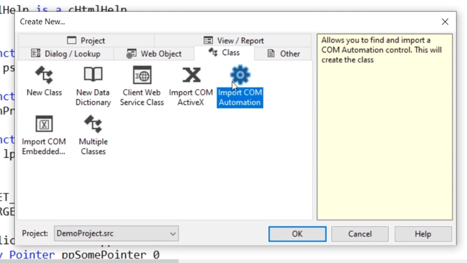 - From the Studio menu, select File > New > Class. Then select ‘Import COM automation’ from the choices.